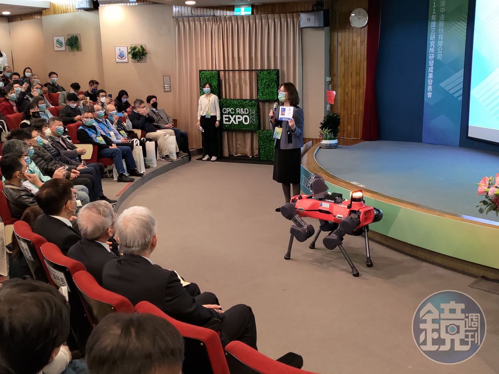 「仿生自動巡檢裝置」─智慧型機器狗是發表會的一大亮點,一出場立刻成為焦點,戴上編號「918779」的員工識別證,編號取諧音「加油吧 機器狗」,它有三大特色,一是能協助儀表辨識,減少例行性的巡檢作業人力,降低生產成本;二是若現場發生氣體洩漏,能偵測到獨特的音波頻率而啟動警戒作用;第三則是引進機器狗輔助人力,能避免人員進入危害或髒污環境,提升設備的上線率,增加生產效率。