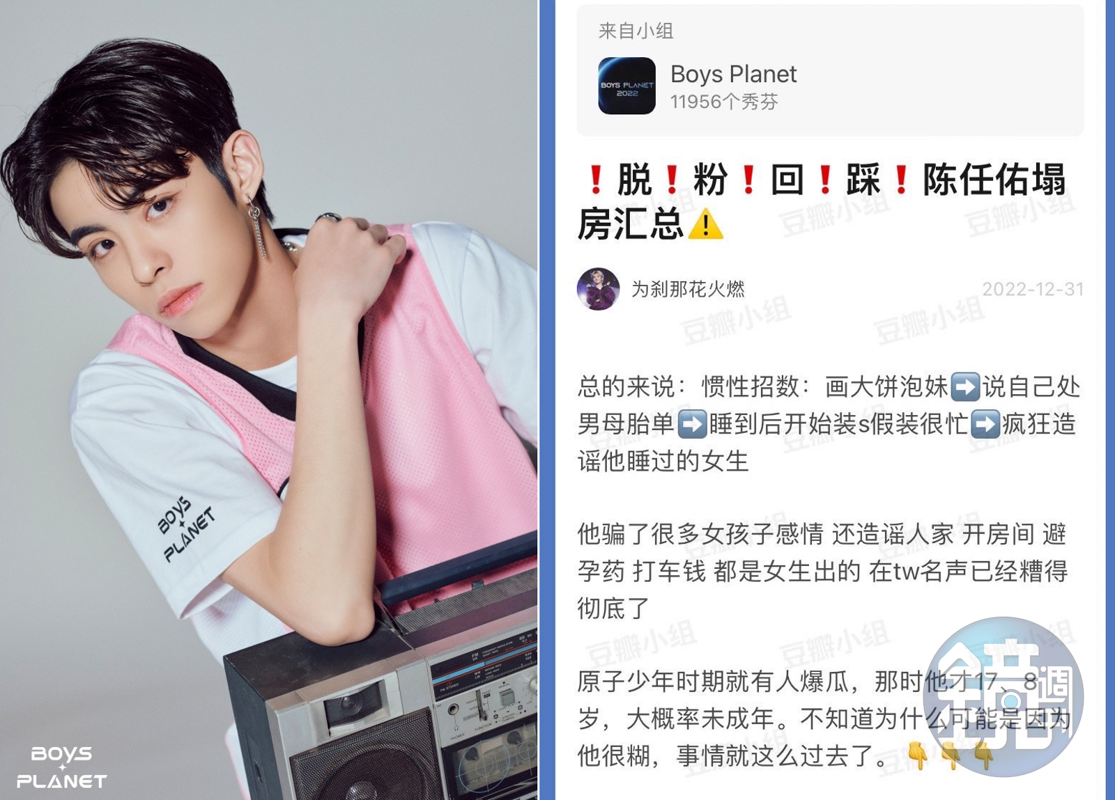 其實早在《原子》播出時就有類似傳聞流出,直指他各種渣男行徑:常裝騙單身女孩感情、發生性關係,甚至稱握有對話紀錄控訴其射後不理,逼女孩無奈只能墮胎。當時陳任佑曾發文捍衛:「是造謠和亂講話,沒有必要浪費時間在這種事上。」沒想到最近參加韓國選秀節目《Boys Planet》後這樁傳聞再度被搬上檯面,許多因《Boys Planet》認識他的新粉絲也氣得直呼要脫粉。
