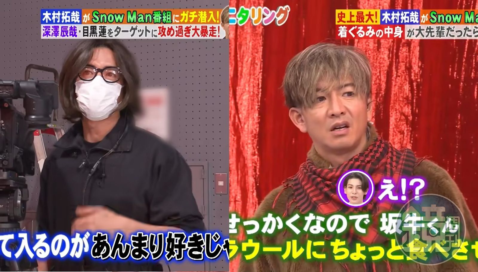 木村拓哉最先鎖定目黑蓮與深澤辰哉,兩人率先錄製Snow Man節目單元,木村戴假髮化身攝影師潛入攝影棚,更多次近距離接觸兩人,兩人都沒發現木村的身分。目黑蓮曾和木村合作連續劇《教場2》,私下也會聯繫彼此,但目黑太過專注於介紹食物,與深澤都沒發現眼前的攝影師是木村,直到後段目黑抬頭才驚覺師兄就在眼前,慌張直呼「讓我釐清一下狀況」、「不是吧?我不知道了啦」,直到確認真的是木村,他與深澤慌張直接滑出攝影棚布幕外,更頻頻發出哇哇叫聲,冷靜後又開心表示「我們居然和木村前輩在綜藝節目中同台」,反應笑壞大批觀眾。