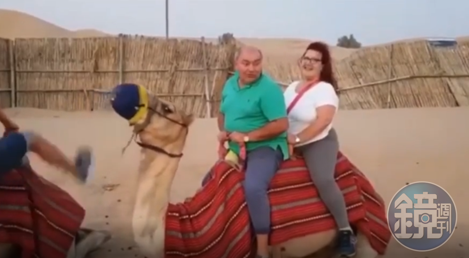 駱駝走了幾步之後,牠似乎無法承受這樣的重量,又或是沒有抓到平衡,前面的駱駝先跪倒在地,後面這隻承載「重量級」夫婦的駱駝便跟著迅速倒地,乘客整個人往前甩,一旁工作人員趕緊衝上前協助。