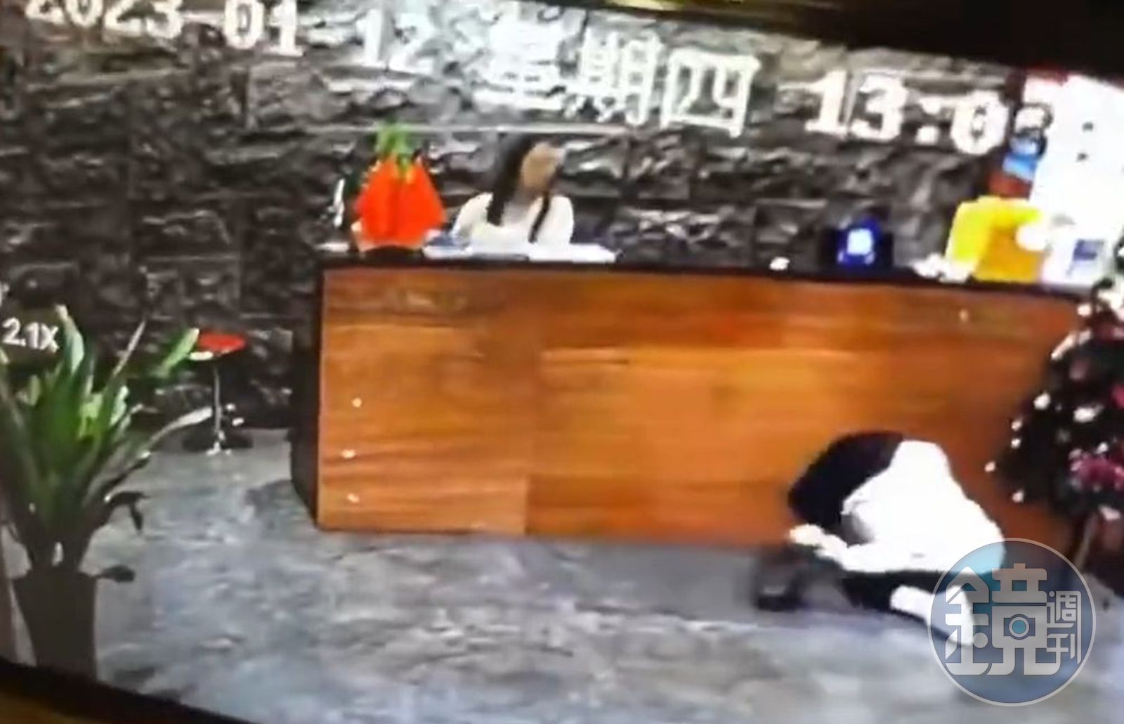 據微博瘋傳影片內容,只見一名長髮女顧客12日到江西省南昌某飯店投宿,身穿白色羽絨衣、白靴的她,推門走進飯店大廳還沒走兩步,就雙腳打結當場踉蹌慘摔,整個人跪嗑在櫃台前,一旁櫃台人員見狀,嚇得趕緊跑出來要攙扶對方,卻沒想到自己還沒走出櫃檯,就先滑倒,整個人摔趴在地板上,還摔得比客人還慘。