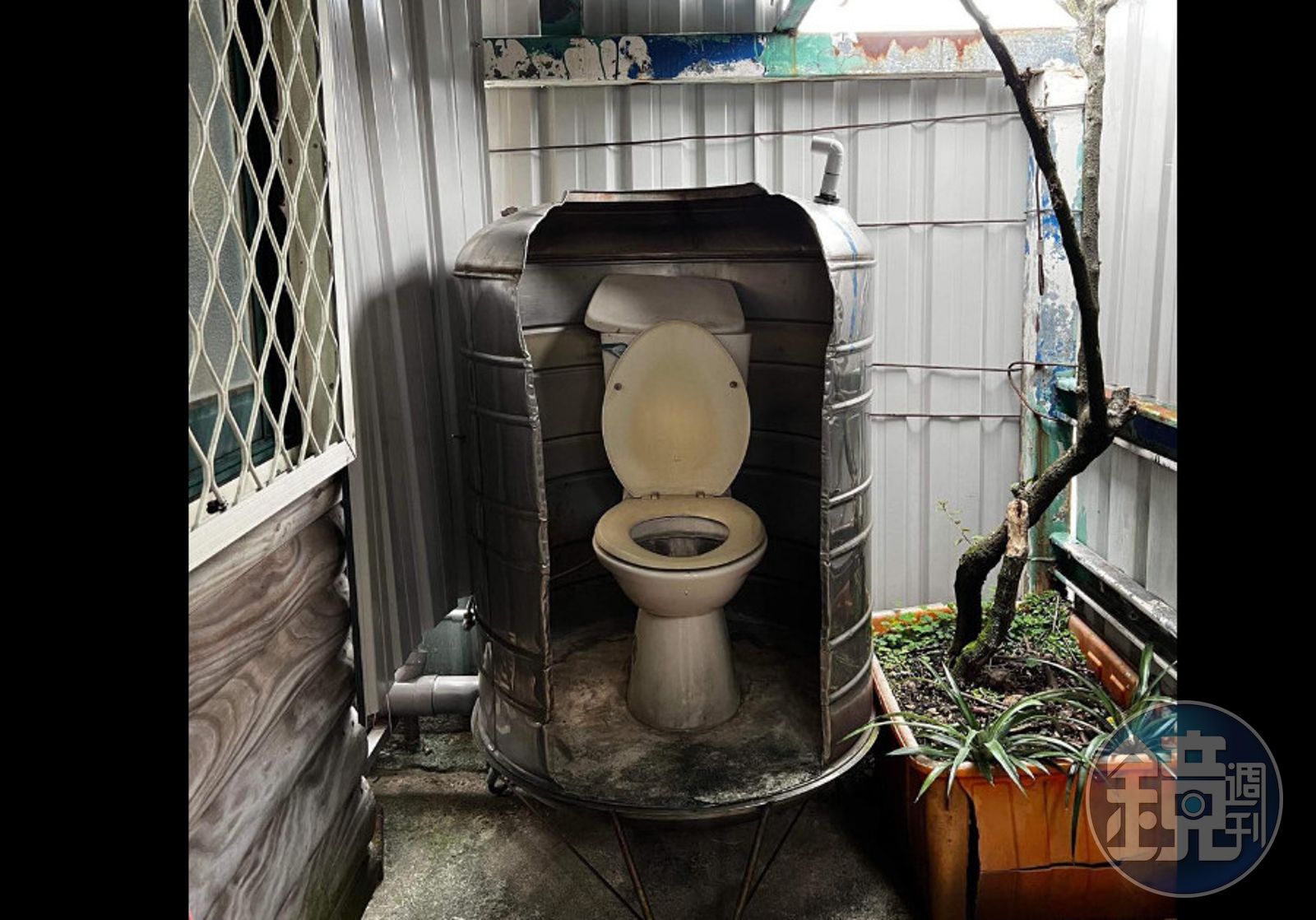 照片中可見房東在頂樓加蓋馬桶,把原本露天陽台處的廢棄水塔切開,內部裝設一個馬桶,馬桶看起來十分髒,而且四周被鐵皮包裹成半露天的狀態,模樣十分簡陋卻帶有獵奇感。