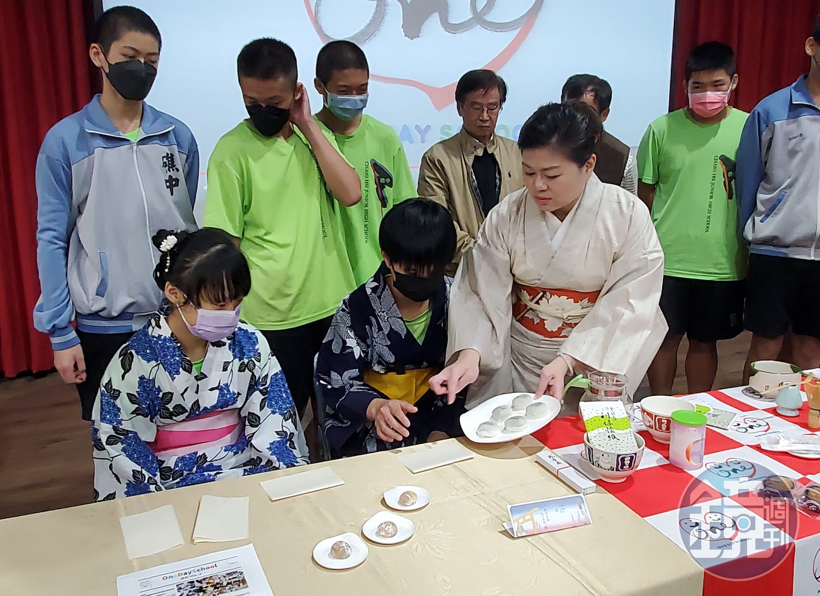 昨(3日)記者會現場,礁溪國中有20位學子到場參加,由大會代表理事渡邊明日香、原理美女士,現場教學及示範日本和服的穿著及抹茶茶道,解說箇中意涵,並提供日本百年老店的麻糬和學生們分享。
