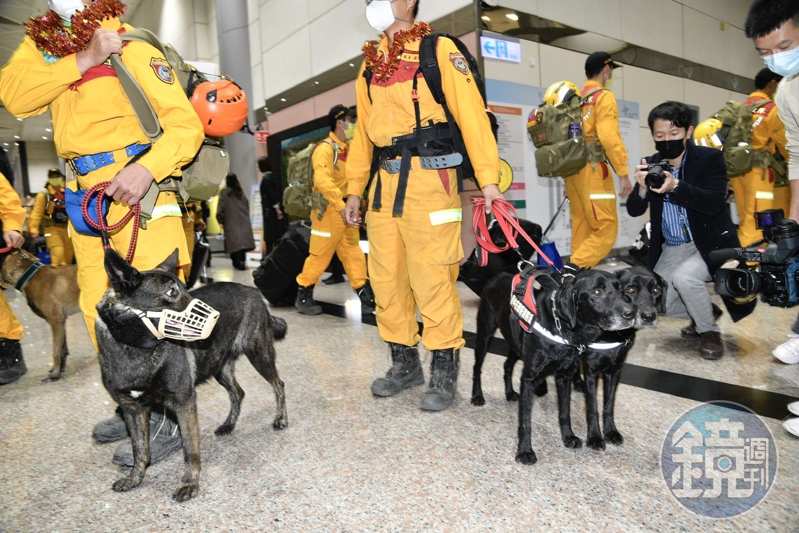 全體搜救隊員與搜救犬入境後,有相關人員對搜救犬進行身分辨識與檢查健康狀況,不過其中有一隻搜救犬的後腳帶傷。領犬員表示,這隻搜救犬在土耳其執行任務時有被刮傷,但這傷勢並不影響牠的搜救能力與行動。做完身分辨識後,全體「汪汪隊」就去上廁所,解放一下,最後出來入境大廳時,一度引發現場其他民眾「瘋狂」。