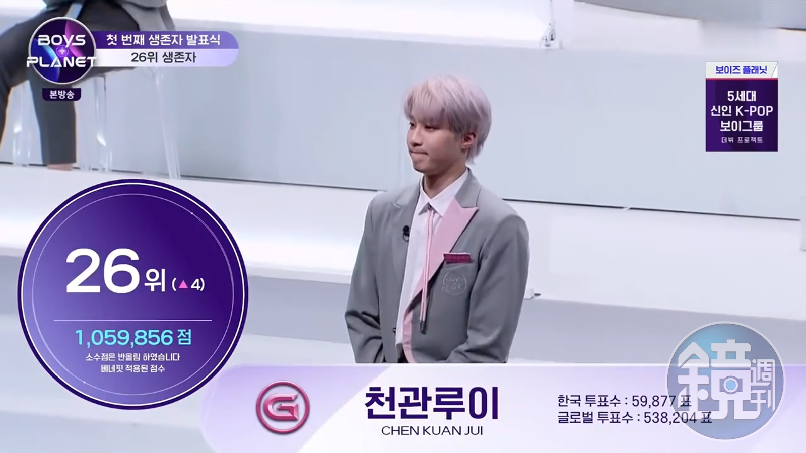 陳冠叡順利通過《Boy Planet》第一次晉級,排名上升了4名,獲得第26名。(截圖自Mnet)