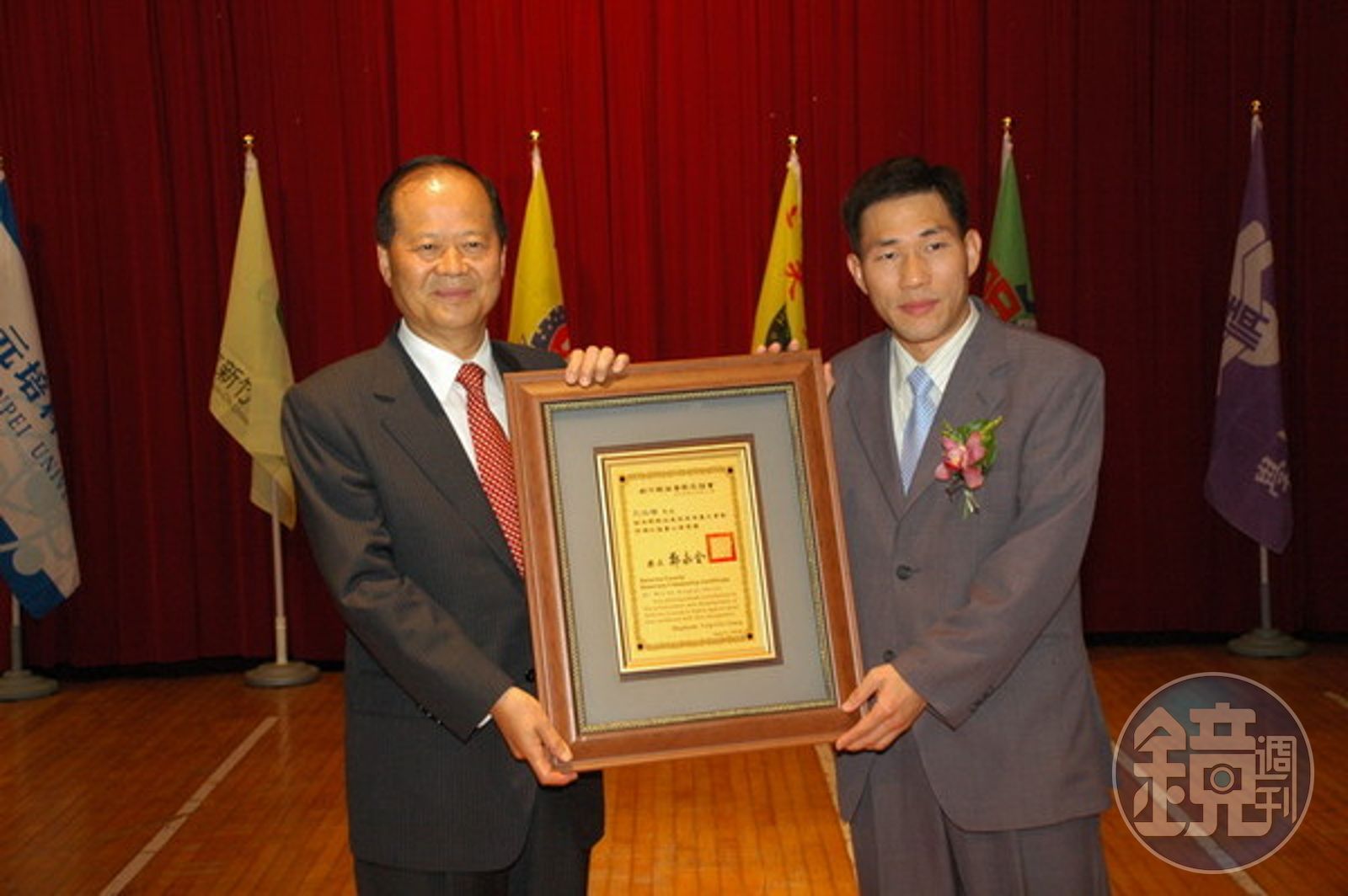 孔玟植(右)2009年曾接受新竹縣長鄭永金(左)頒發榮譽縣民證。(取自新竹縣政府網站)