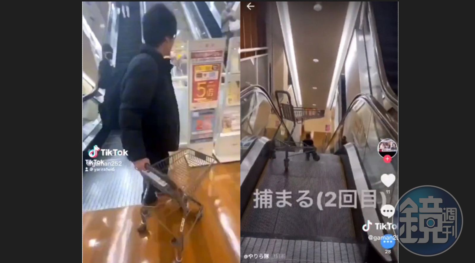 影片中顯示,一群日本年輕人聚在百貨公司內,故意挑有乘客搭乘手扶梯時,將超市購物手推車推落,當下搭乘民眾只能倉皇逃生,幸好沒有砸到人,而這群少年們在犯案後嘻笑地逃離現場。