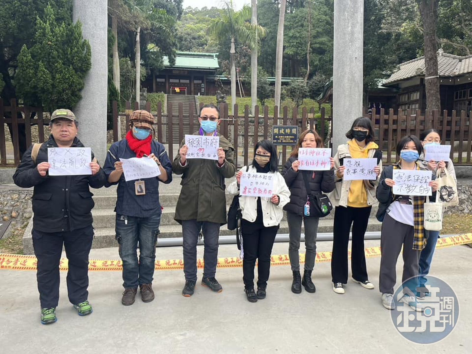 桃園市府將廠商請來的日本天照大神送回日本,不僅引發綠營不滿,昨(13日)也有民眾來到桃園神社前舉牌抗議,質疑「日本神社不能有日本神」「桃園市府勿限制宗教自由」「張X政違法亂政」;知名YouTuber視網膜看到桃園神社前的日式燈籠被拆除也表示憤怒,感嘆「明天過後也不再是名符其實的神社」。