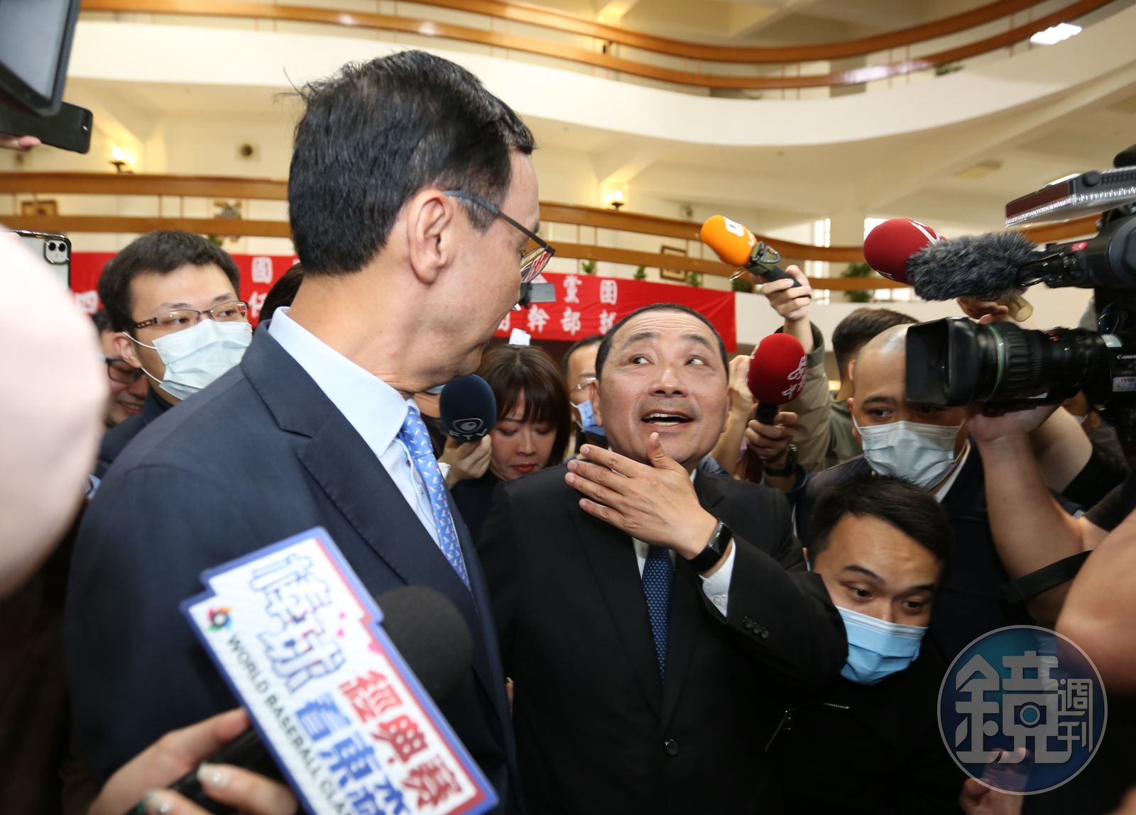 隨後朱立倫抵達現場,見到侯友宜時上前握手寒暄打招呼,氣氛融洽,侯友宜說彼此是老朋友了,而朱立倫在致詞時也特別提到侯友宜是最好的市長,是國民黨最強的母雞,喊話國民黨團一定和民眾站在一起,讓民眾過好日子,呼籲大家一起團結努力,一起面對2024的挑戰。