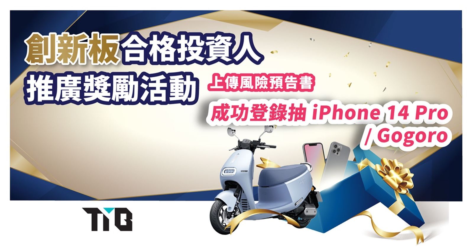 其中合格投資人自即日起至12月底止,只要簽署「臺灣創新板上市有價證券風險預告書」,經證券商完成適格性審查,並成功於活動網站登錄,就有機會獲得隨心享樂券1,000元、iPhone 14 Pro、Gogoro機車等優質大獎,總獎品價值逾200萬。