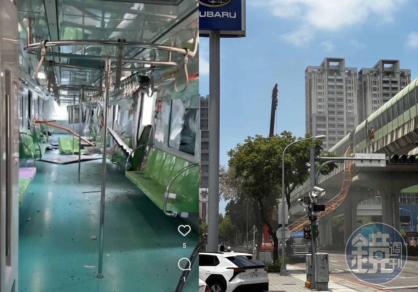 工地疑似吊掛鋼梁不慎,掉落貫穿台中捷運車廂。(翻攝自記者爆料網)發布時間:2023.05.10 13:30 臺北時間