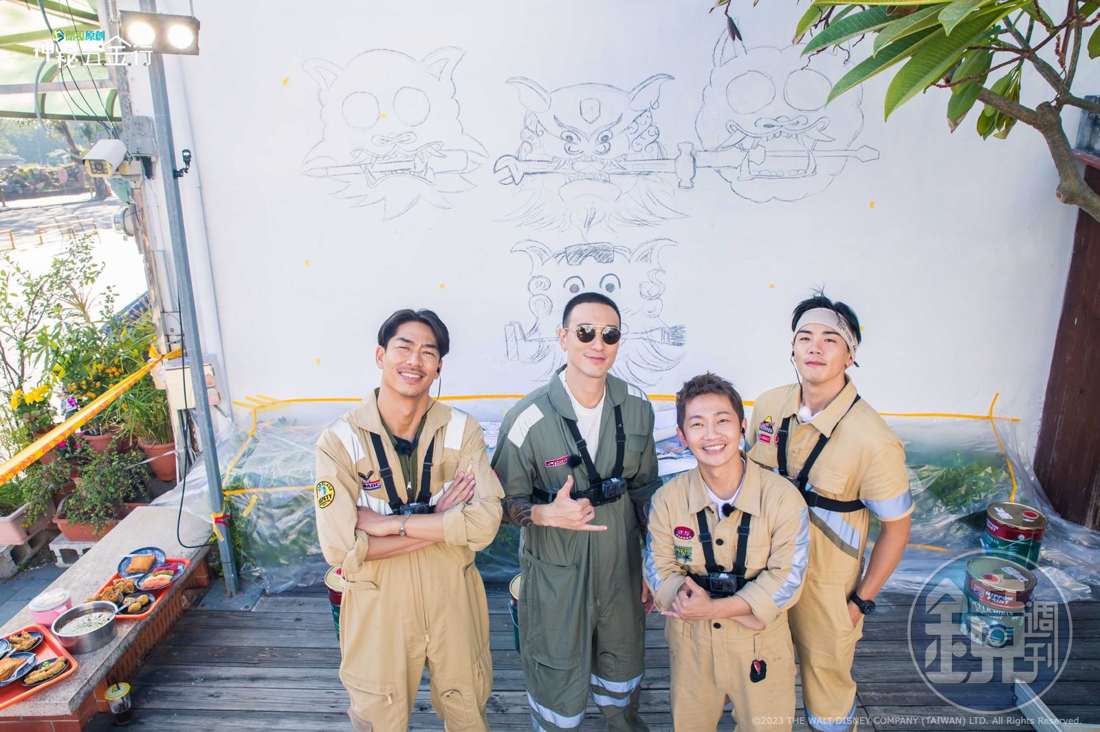 但畢竟要畫在偌大的牆面上並不是件容易的事,AKIRA、王陽明、禾浩辰和蔡昌憲,到了現場後發揮團隊合作,先用尺測量距離,用膠帶貼出上下左右界線,討論出各自要畫的劍獅位置。