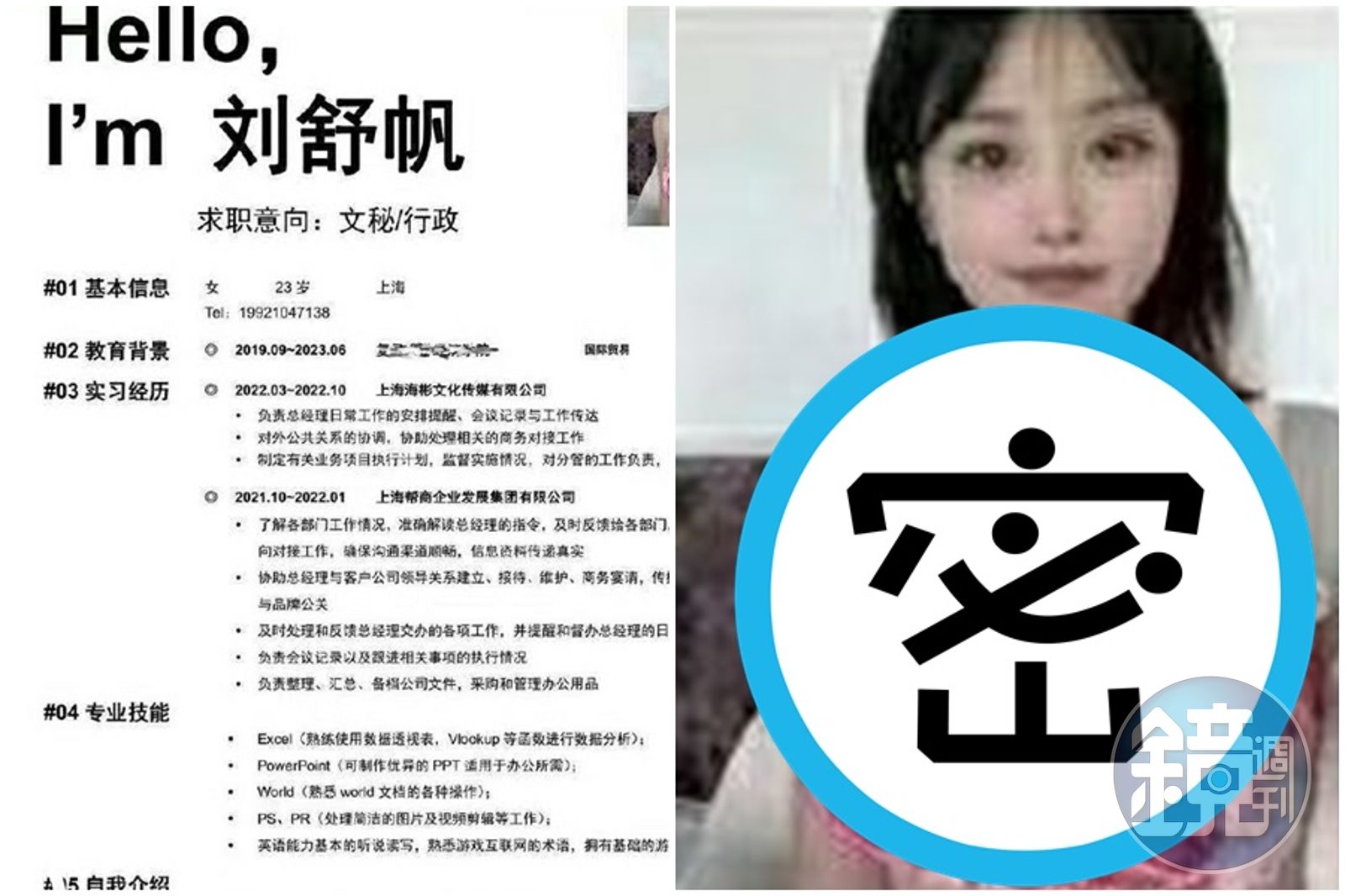 根據該份履歷資料,應徵者為上海復旦大學的23歲的劉姓畢業生,其應徵職務為行政祕書,曾在上海2家企業實習,除了基礎文書及英文能力,還在簡介中提到「本人思想端正、勤奮學習、刻苦鑽研、能吃苦耐勞,有崇高的理想和偉大的目標」,並強調「注重個人道德修養…具有良好的思想道德品質…在工作上有良好的組織交際能力。」