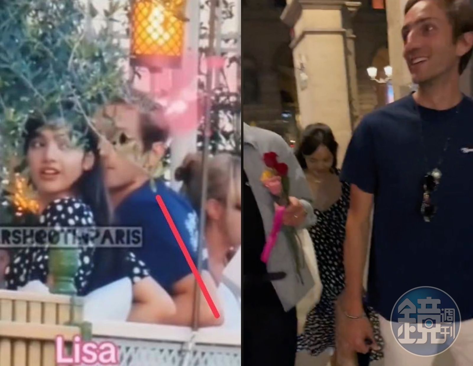 穿著黑底圓點連身裙,綁著公主頭還露出額頭的Lisa,在巴黎一家高級餐廳的露天座位用餐,身旁坐著藍色衣服的男子,兩人有說有笑;Lisa轉頭不知道看到什麼引起了她的注意,拿起手機拍了一會兒,接著藍衣男子也轉頭拿起手機,互動非常自然親暱。