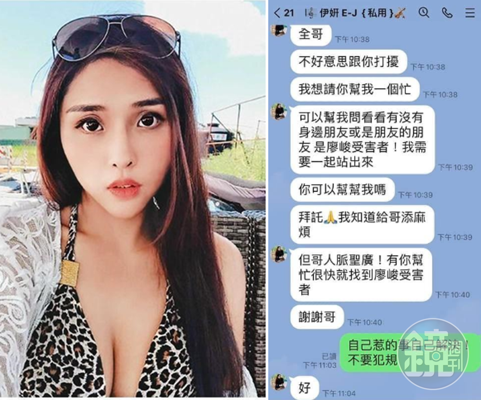 李伊妍日前公開發文影射資深藝人廖峻性騷,廖峻則無奈批評對方想紅想瘋了亂講話,甚至拖著病體就赴法院提告以捍衛自己的清白,李伊妍則被網紅雪碧爆出私下求助連千毅的大哥「全哥」出手幫忙滅火,但是遭到對方狠狠拒絕。