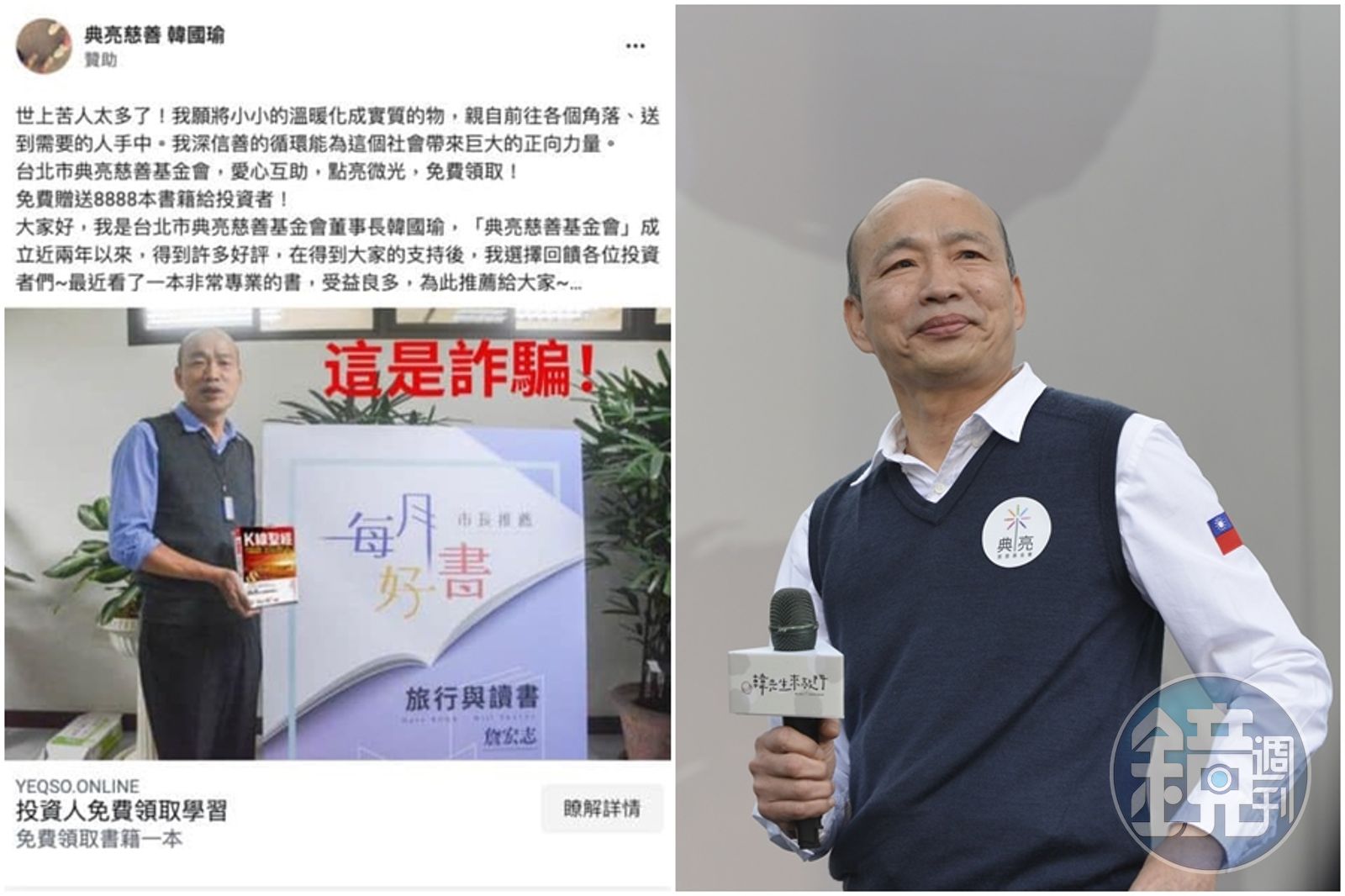 根據韓國瑜po出的兩張被詐騙集團冒用名義的截圖,其中一張臉書的名稱為「典亮慈善 韓國瑜」,詐騙集團仿照韓國瑜口吻寫下:「世上苦人太多了!我願將小小的溫暖化成實質的物,親自前往各個角落、送到需要的人手中。我深信善的循環能為這個社會帶來巨大的正向力量。」還表示「最近看了一本非常專業的書,受益良多,為此推薦給大家」,透露將免費贈送8,888本書籍給投資者。另一張則是假的「韓國瑜」LINE帳號,名字下方還寫著:「做優秀的投資者,並不需要高智商」,其實這些全都是詐騙。