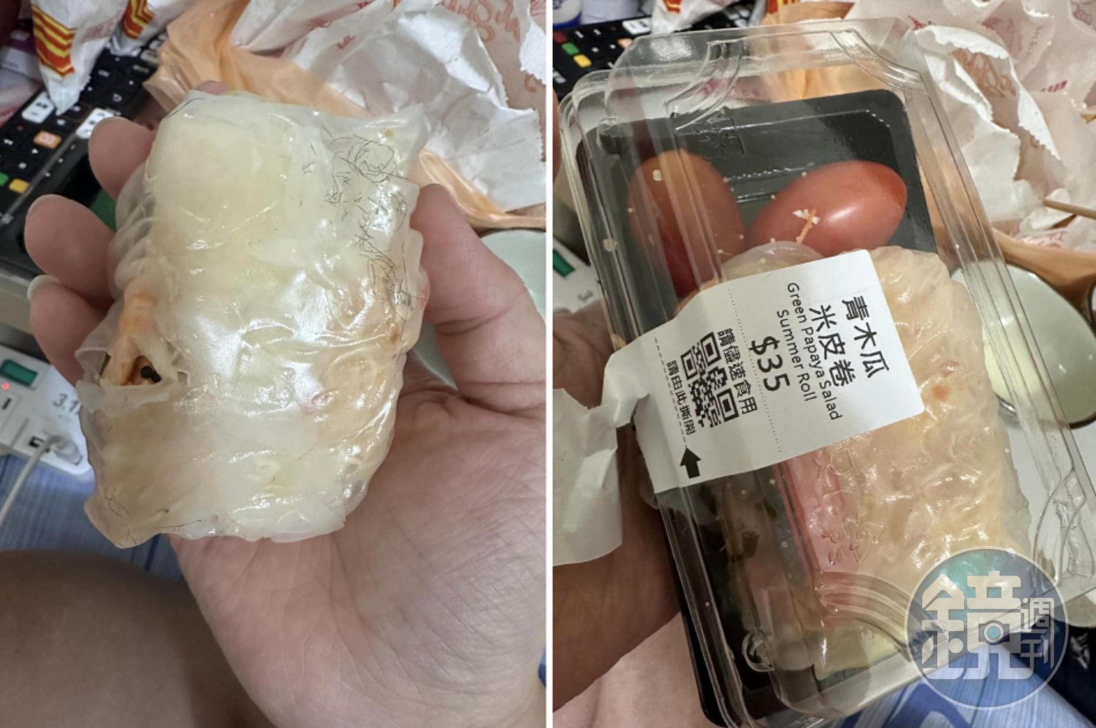 原PO在《爆料公社公開版》發文表示,她在東區的『爭鮮gogo』買了「青木瓜米皮捲」但翻開來都是毛!讓她痛罵「X…這到底是X小啦!」,並且上傳了一支影片及兩張照片。畫面中顯示,這個的內容物有兩顆小番茄以及米皮捲,要價僅35元,可說是經濟又實惠,但殊不知原PO將米皮捲拿起來後,發現背面「滿滿的毛」讓她整個無名火都上來,直呼「誰敢吃?」