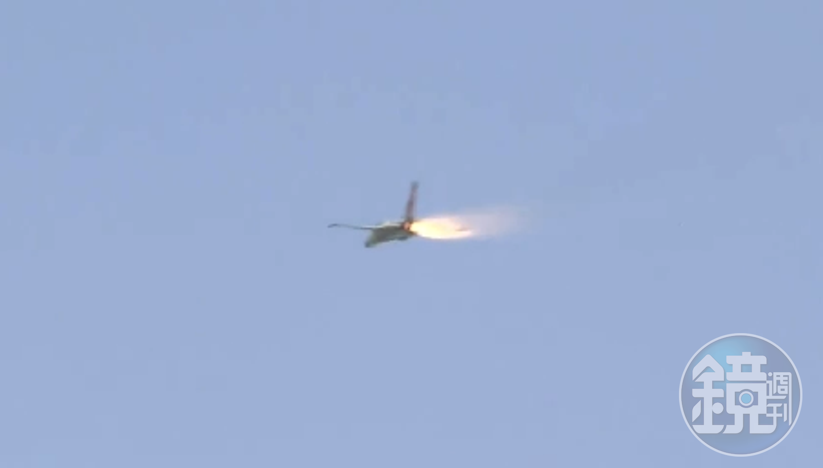 台中清泉崗基地今上午進行演練,不料,一架IDF戰機,在空中發動機突然起火。(翻攝畫面)發布時間:2023.08.10 11:45 臺北時間