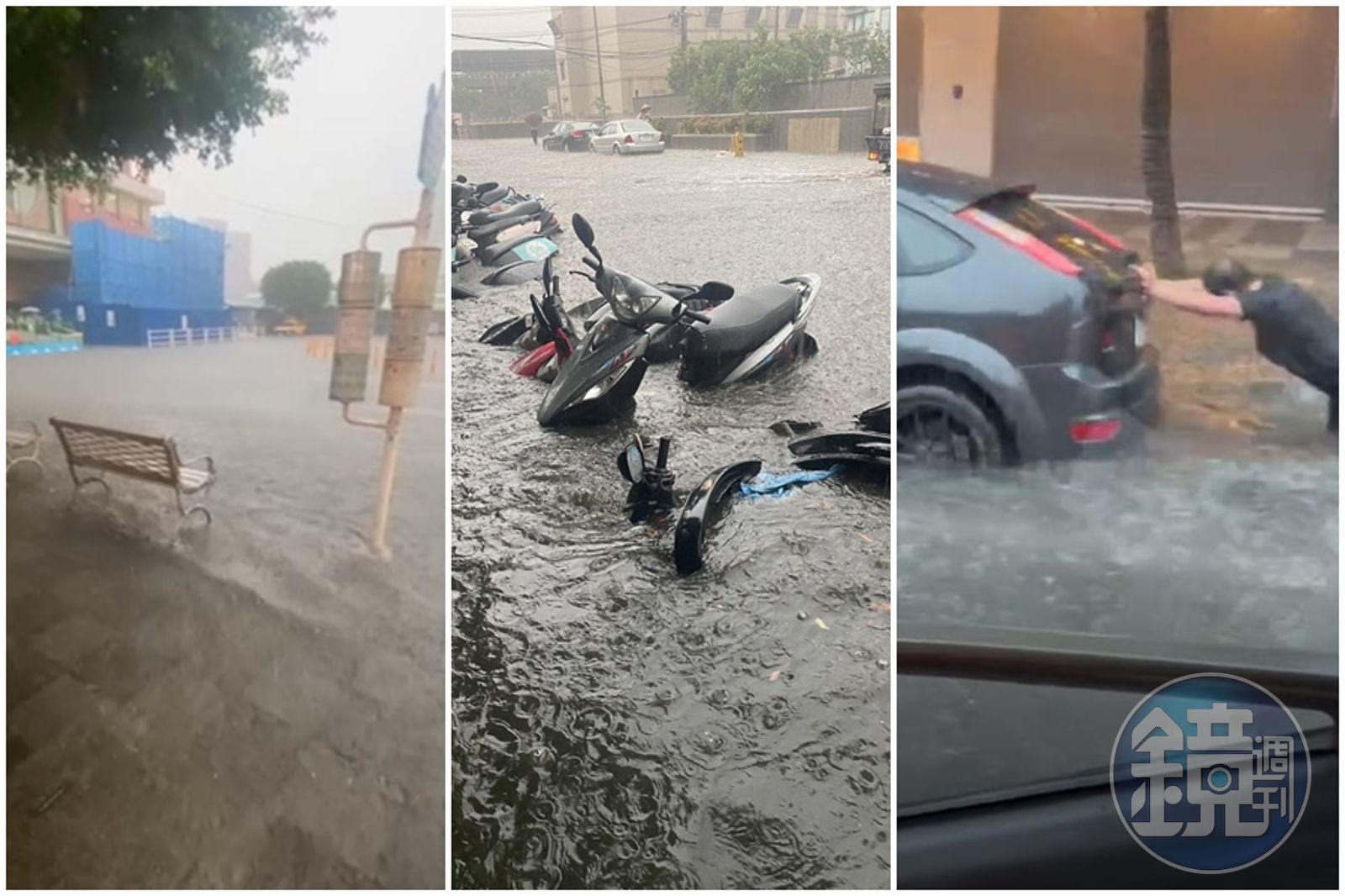桃園龜山工業區雨勢甚至更恐怖,桃鶯路路邊的停放車輛幾乎滅頂,已經有機車浮在水面上。