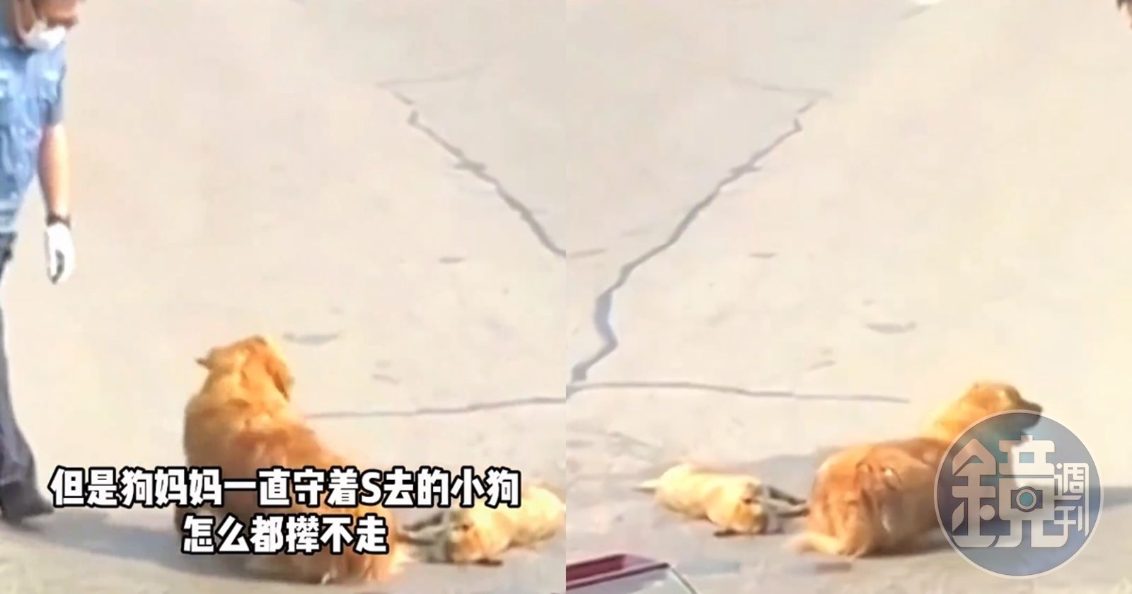 影片中可以看到,在車來車往的大馬路上有一隻黃金獵犬,一旁有隻死去倒地的小狗,大巴司機下車試圖引導黃金獵犬媽媽離開,但黃金媽媽怎麼樣就是不走,甚至一度上前逼退司機,最終再趴回小狗身邊,持續守著。