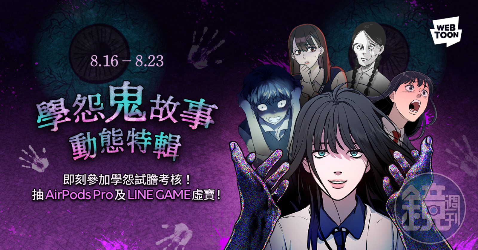 LINE WEBTOON今年邀請Pony、JUJU C.、璐奇以及竹川獅4位創作者推出《學怨鬼故事・動態特輯》,攜手將日常的校園風景打造為畫風驟變的詭譎場景,再利用動態畫面與靈異音效,希望讓讀者「身歷其境」,親身揭開藏在校園中的靈異面紗。