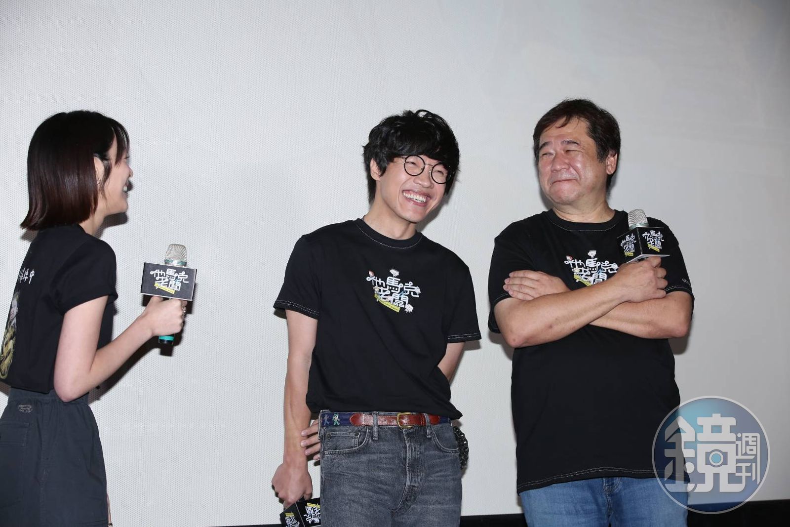 瞿友寧(右)與盧廣仲(中)對劉冠廷與孫可芳公布求婚成功喜訊都很開心。發布時間:2023.08.22 14:51 臺北時間