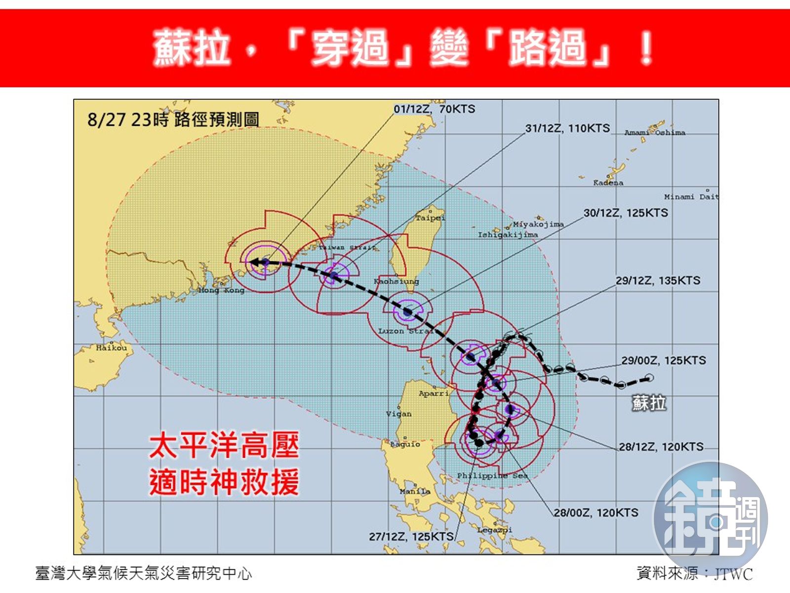 氣象粉專「林老師氣象站」今早發文表示,蘇拉來勢洶洶,以強颱之姿逐步逼近台灣,根據早前預報,在8月30日晚間至31日,是最靠近台灣的時段,預期所伴隨的強風驟雨也將會是最為明顯。 而最新預測則顯示,蘇拉颱風「穿過變路過」,林老師說明是因太平洋高壓「神救援」,蘇拉颱風走了一條對台灣傷害最小的路徑,「這又再一次驗證說,天佑台灣!」林老師也提到,這也是4年多來,持續沒有颱風中心直接登陸台灣的紀錄。 不過林老師也提醒,雖目前預測蘇拉不會登陸台灣,但不可輕忽對台灣局部地區風、雨、浪的影響,海上颱風警報及陸上颱風警報也還是照時都會發佈,千萬不可因此而大意輕忽。