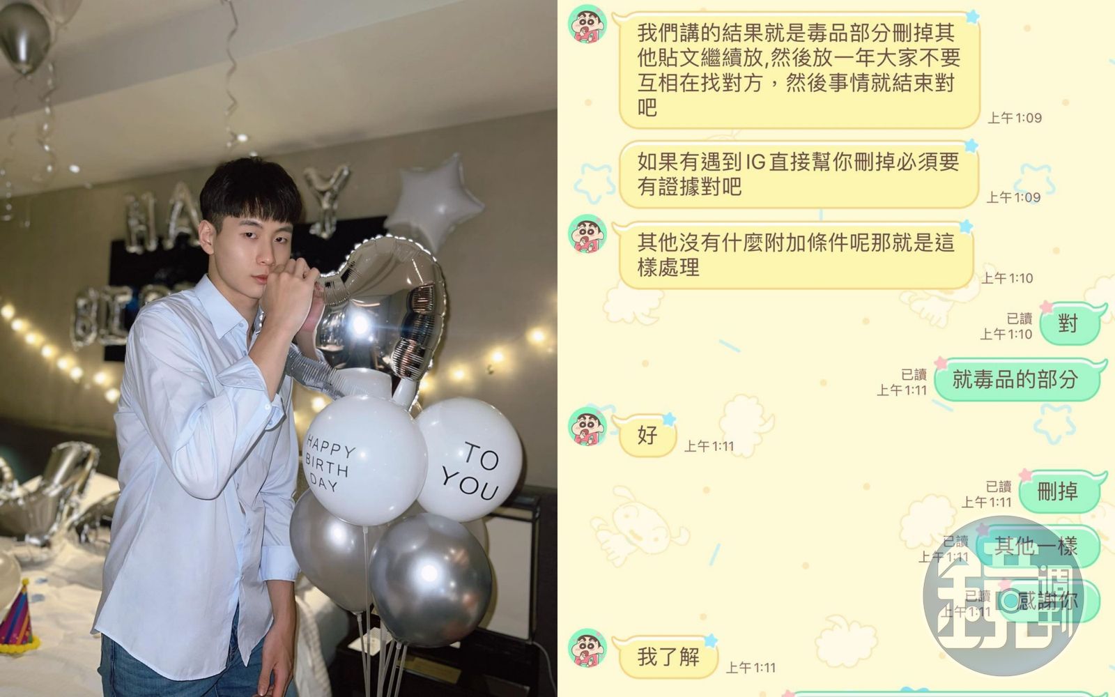 不僅如此,截圖顯示林子安事後還叫他所謂的叔叔來說情,希望刪除聲明中關於毒品的部分,許祐瑋更爆:「(林子安)還要給我一筆錢,我還有骨氣並沒有收你們的封口費。」更怒到要大家評評理「誰受傷最大?為何做錯事的人死不承認還惡人先告狀…難道當初不公開導致是我的錯?」