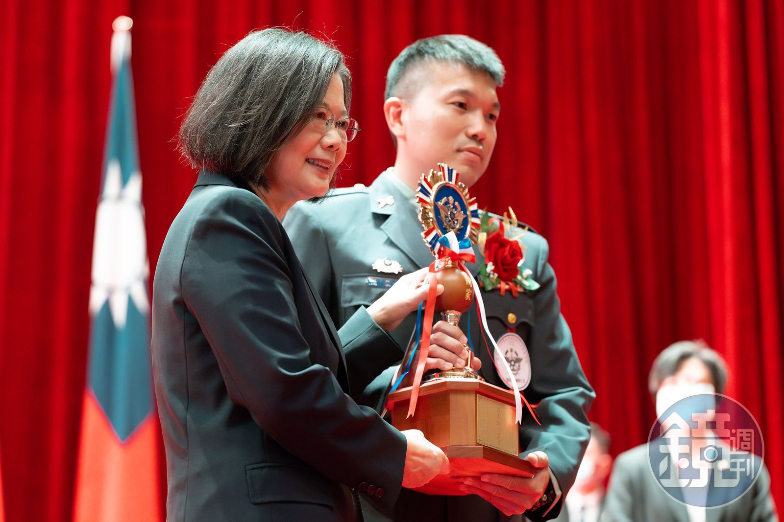 蔡英文指出,國軍弟兄姊妹都在各自的崗位上為守護國家努力。例如陸軍游雅婷中校,是首位步兵營女性營長。她除了帶領官兵執行軍事訓練、負責新制教召,也很關心部屬,是今年的國軍楷模。