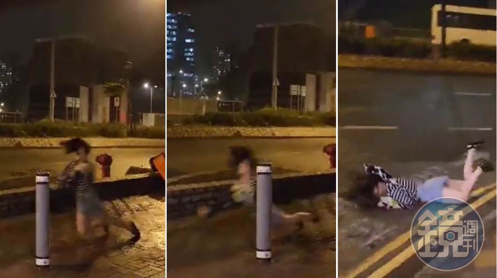 台灣幸運躲過「超級強颱」蘇拉的肆虐,但香港就沒這麼幸運了,號稱有「完美風暴」的蘇拉,風力相當於10號風球,於昨晚(9月1日)襲擊香港。而在這暴風期間,網路上瘋傳了一部颱風實況影片,影片中,天色昏暗風雨交加,突然有一名熱褲妹從右方的人行道整個「彈出來」,並且臉朝下如「溜冰」般趴著向前滑行約10米至馬路上,所幸附近沒有行徑的車子,沒有釀成更嚴重的傷害。