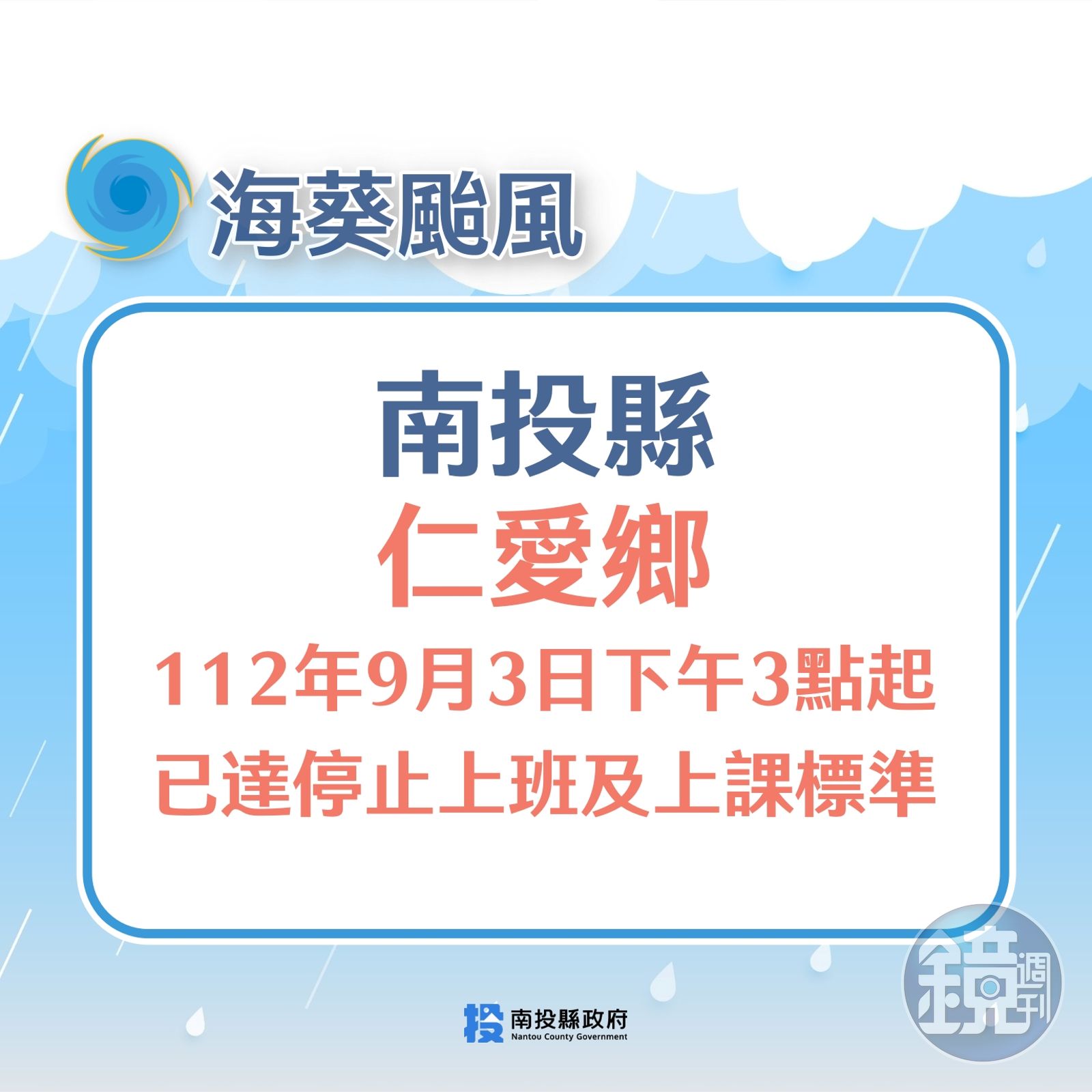 - 南投縣:仁愛縣下午3時起停止上班上課