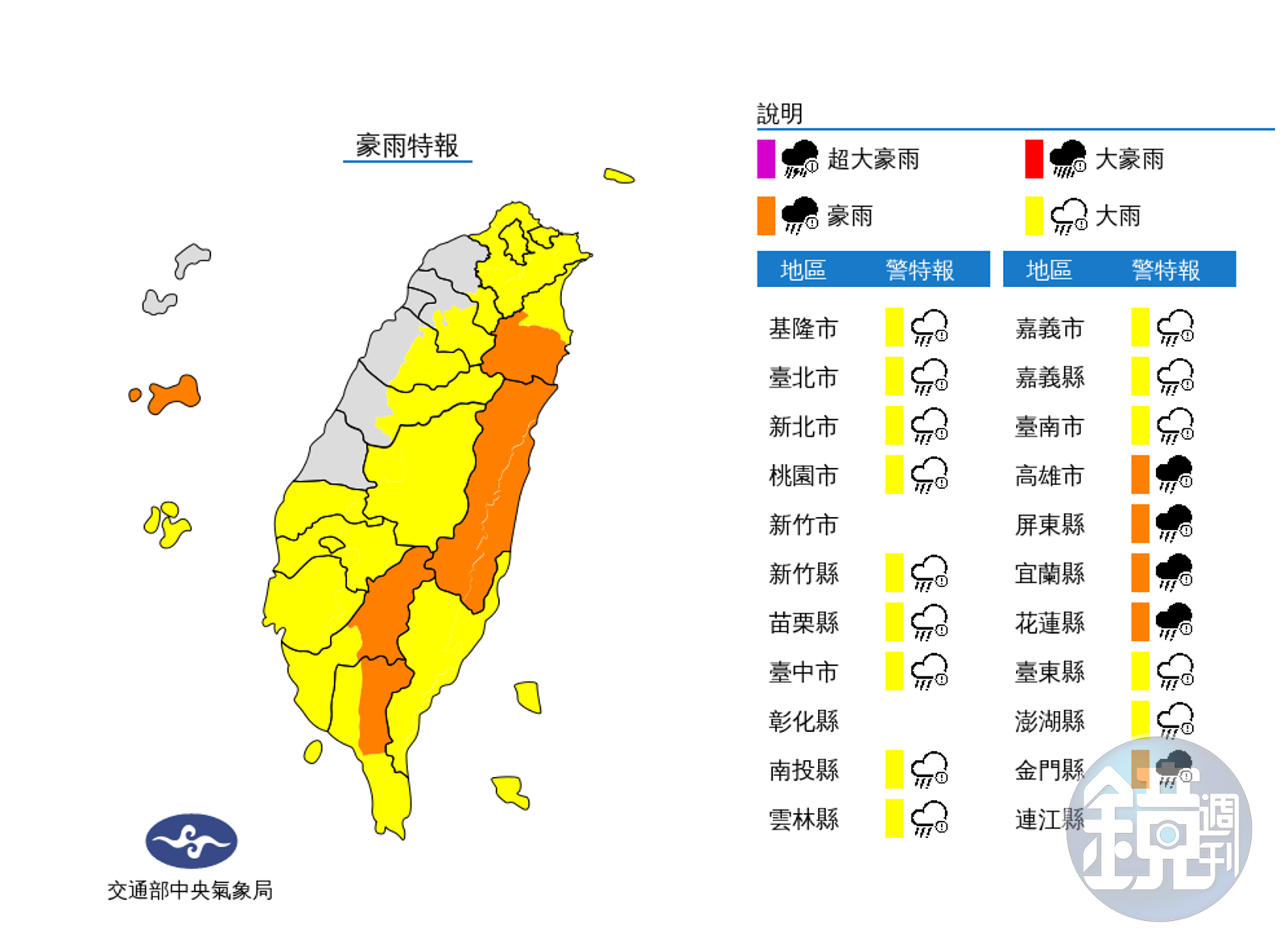 中央氣象局指出,受海葵颱風及其外圍環流影響,易有短延時強降雨,4日宜蘭縣、高雄市、屏東縣山區及花蓮縣、金門縣有局部大雨或豪雨發生的機率。 大雨警示範圍則包括,基隆北海岸、大臺北、南投、宜蘭、臺東、雲林以南地區及桃園至臺中山區、澎湖;山區請慎防坍方、落石、土石流及溪水暴漲,低窪地區請慎防淹水。 陸上強風特報範圍,則為新北市海岸、澎湖及金門地區有9至10級強陣風出現,其他沿海空曠地區及馬祖亦有局部8至9級強陣風。