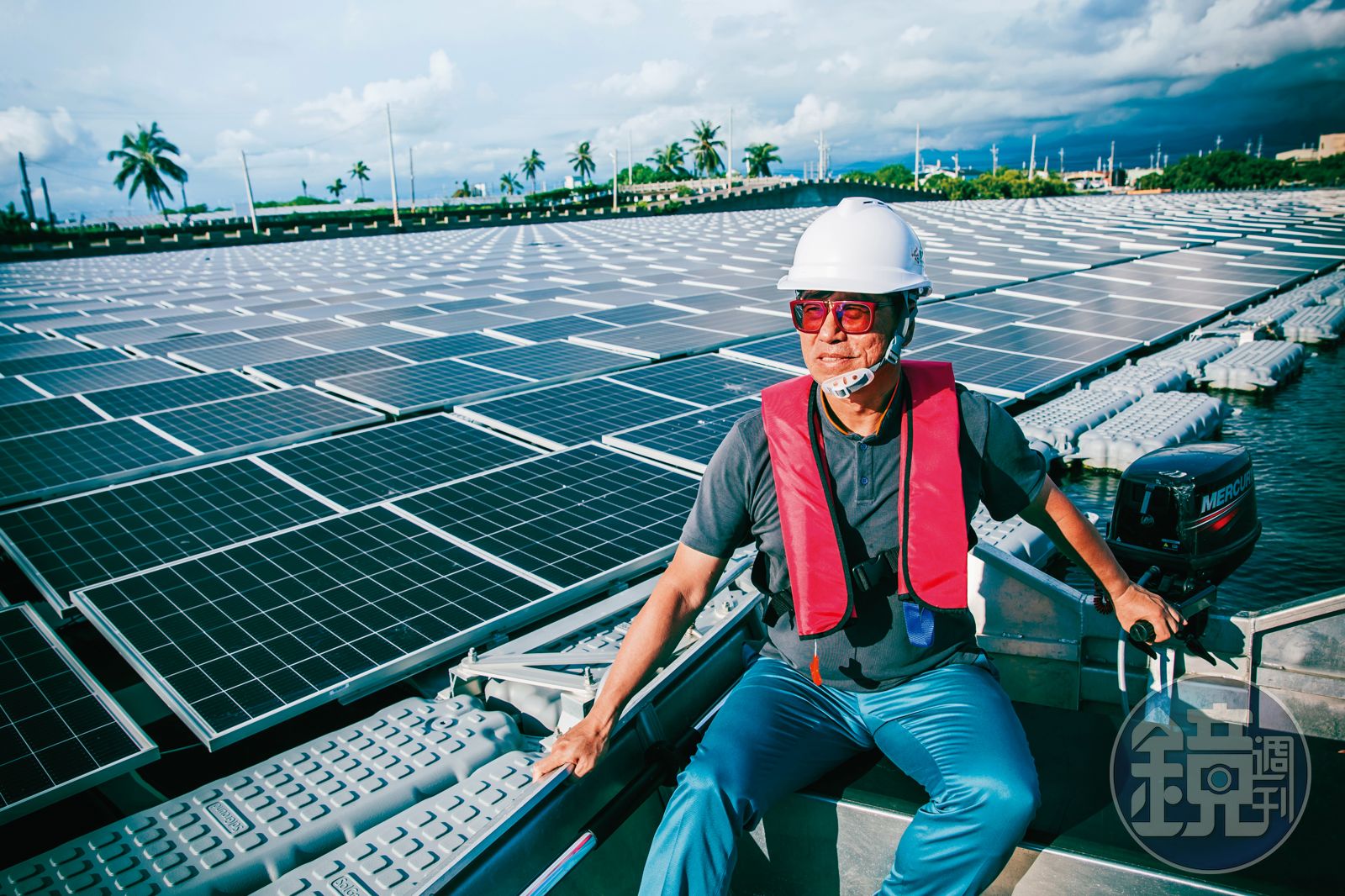 他帶記者搭維運小船實地察看,水面下需先清淤泥,放入水泥沉塊,固定浮島,才能架設太陽能板在水面上,「因為水太淺,打樁船浮不起來,用怪手又會沉下去,只能找做過離岸風電和碼頭的海事工程公司來做,我們整地還整到眼鏡蛇和鱷魚跑出來。」