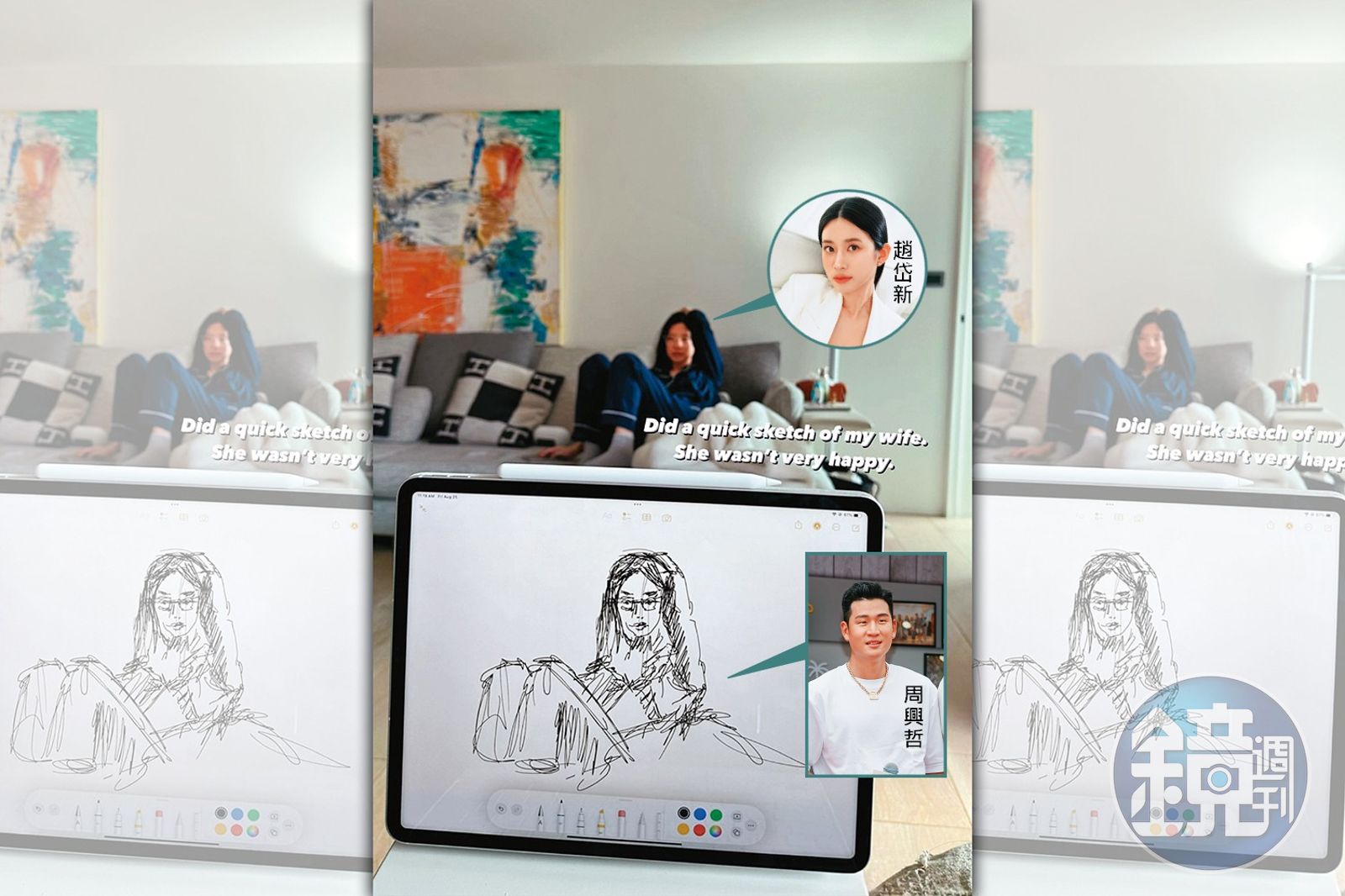 周興哲不時在社群分享偷拍愛妻的照片,這次他偷偷為趙岱新作畫,結果卻尷尬了!他無奈透露:「給妻子畫了一張素描,她不太高興。」仔細一看周興哲的作品…欸,這分明是金門「女戰神」立委陳玉珍吧?女神畫成戰神,還不快去上課重畫!(指門外)