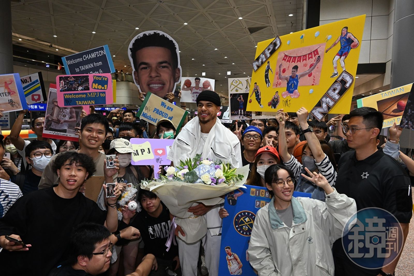 NBA丹佛金塊隊冠軍前鋒小波特(Michael Porter Jr.)今(6日)清晨抵達台灣,展開預計4天3夜的訪台行程。現場約有百名熱情球迷接機,他也一一回應球迷簽名及合照要求,展現親和力。