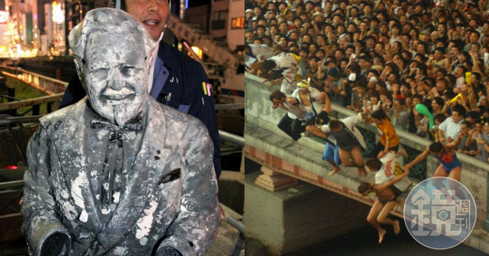 1985年阪神虎睽違24年奪得日本第一,興奮的虎迷湧進道頓堀川跳河慶祝,肯德基道頓堀分店的肯德基爺爺也被扛起丟進河裡後失蹤,未料此後阪神虎戰績低迷,被虎迷認為是「肯德基爺爺的詛咒」,為此肯德基重新製作一尊肯德基爺爺,希望能阻止這不祥的都市傳說,直到24年後的2009年,大阪對道頓堀川進行河底清掃工作,當年受害的肯德基爺爺才被打撈起,但上、下半身分離,眼鏡、雙腿及左手始終未尋獲。