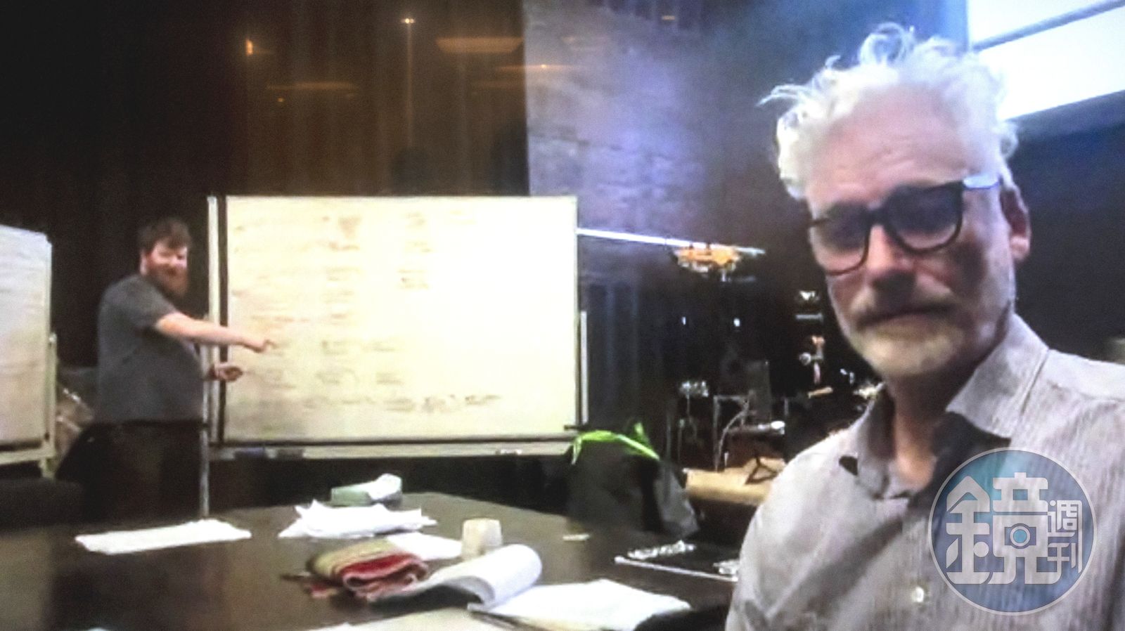 視訊採訪時,布魯斯拿起筆電,向我們介紹排練場的狀況,1張大會議桌,桌前擺著2張白板,「上面寫著我們對下一個作品的所有想法。我們會坐在這裡,帶著點子過來,然後演員們會走到那裡(排練場地)進行即興表演。」至於10月底將來台演出的《獵人成為獵物的影子》,因為一切都關乎對話,「所以我會記錄演員在桌子周圍的討論和即興創作,收集一系列的橋段,研究這些想法如何相互關聯。在某種程度上,我們不斷問自己,這裡面有什麼利害關係?這個節目想探討什麼事?我們想說什麼?這是一個非常有機的過程。」