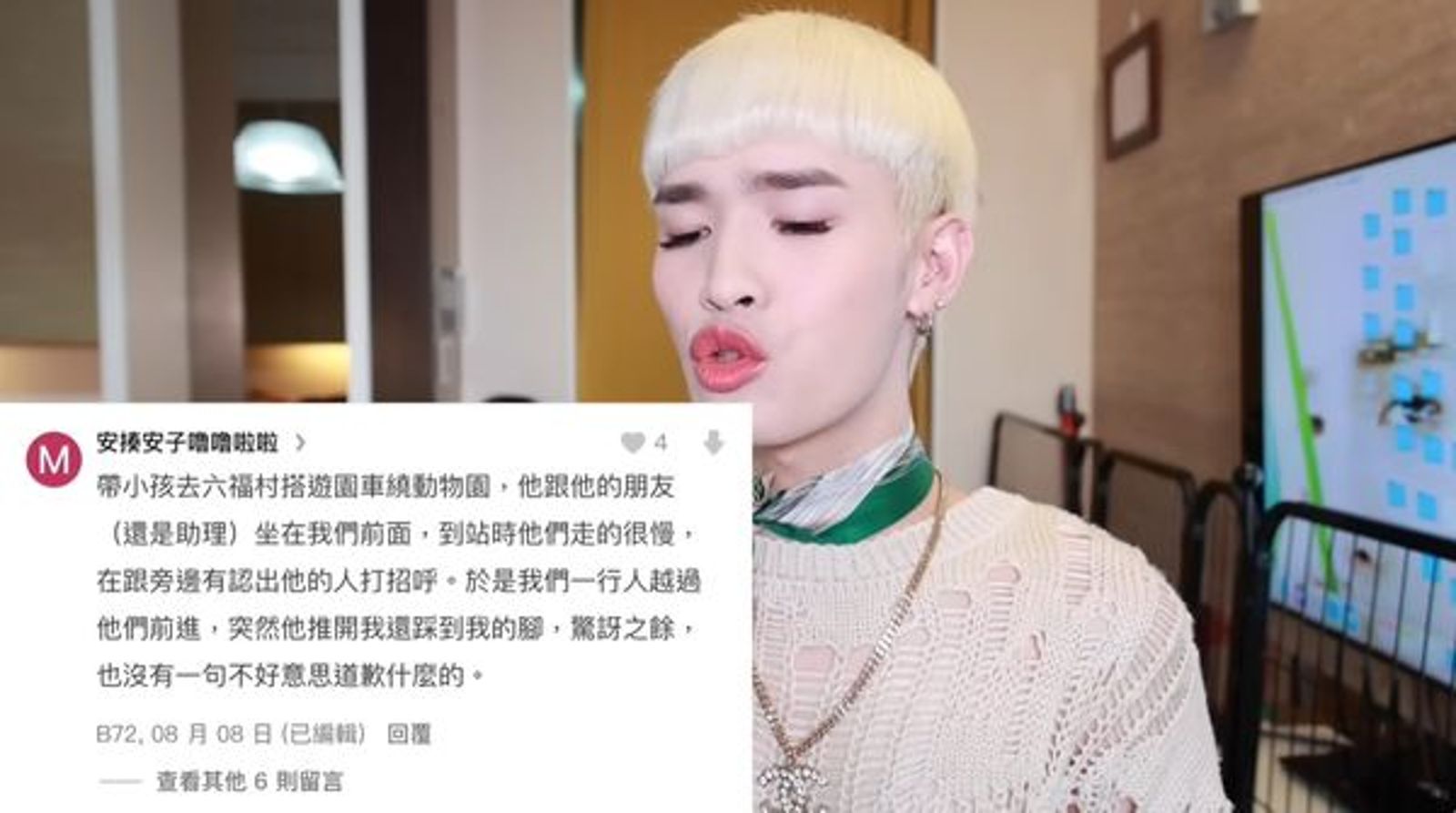 鍾明軒日前拍攝影片回復酸民,其中有一篇來自Dcard的網友指稱,曾經在六福村遭到鍾明軒「推開還踩腳」,讓鍾明軒火大,認為遭到抹黑「我非常樂意告你耶」,但雙方後續也透過私訊溝通,化解這場誤會。
