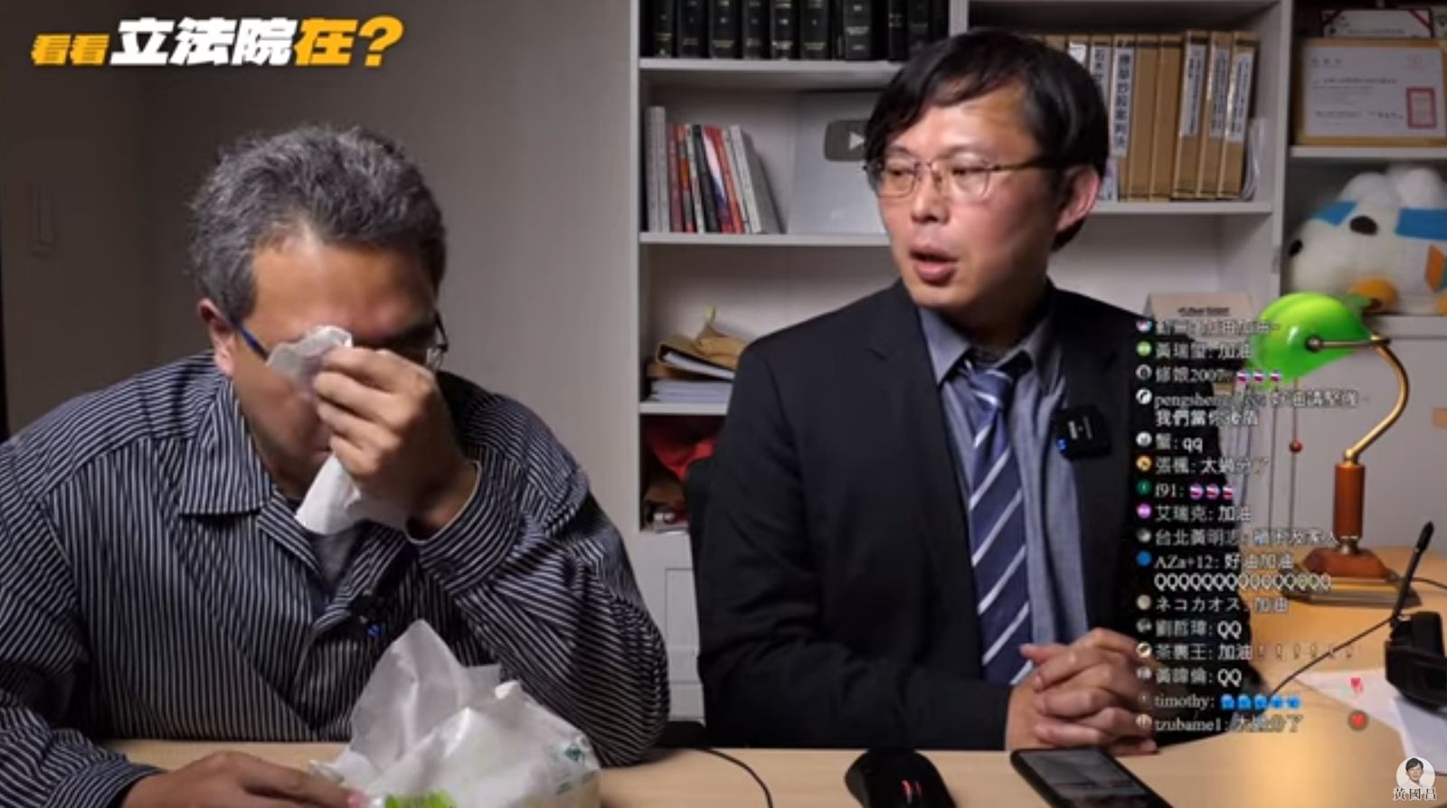 臉書粉專「Linbay好油」版主林裕紘(左)上黃國昌(右)的節目哭訴被恐嚇,沒想到恐嚇案件竟是自導自演。(翻攝自黃國昌YouTube)發布時間:2023.10.03 17:49 臺北時間