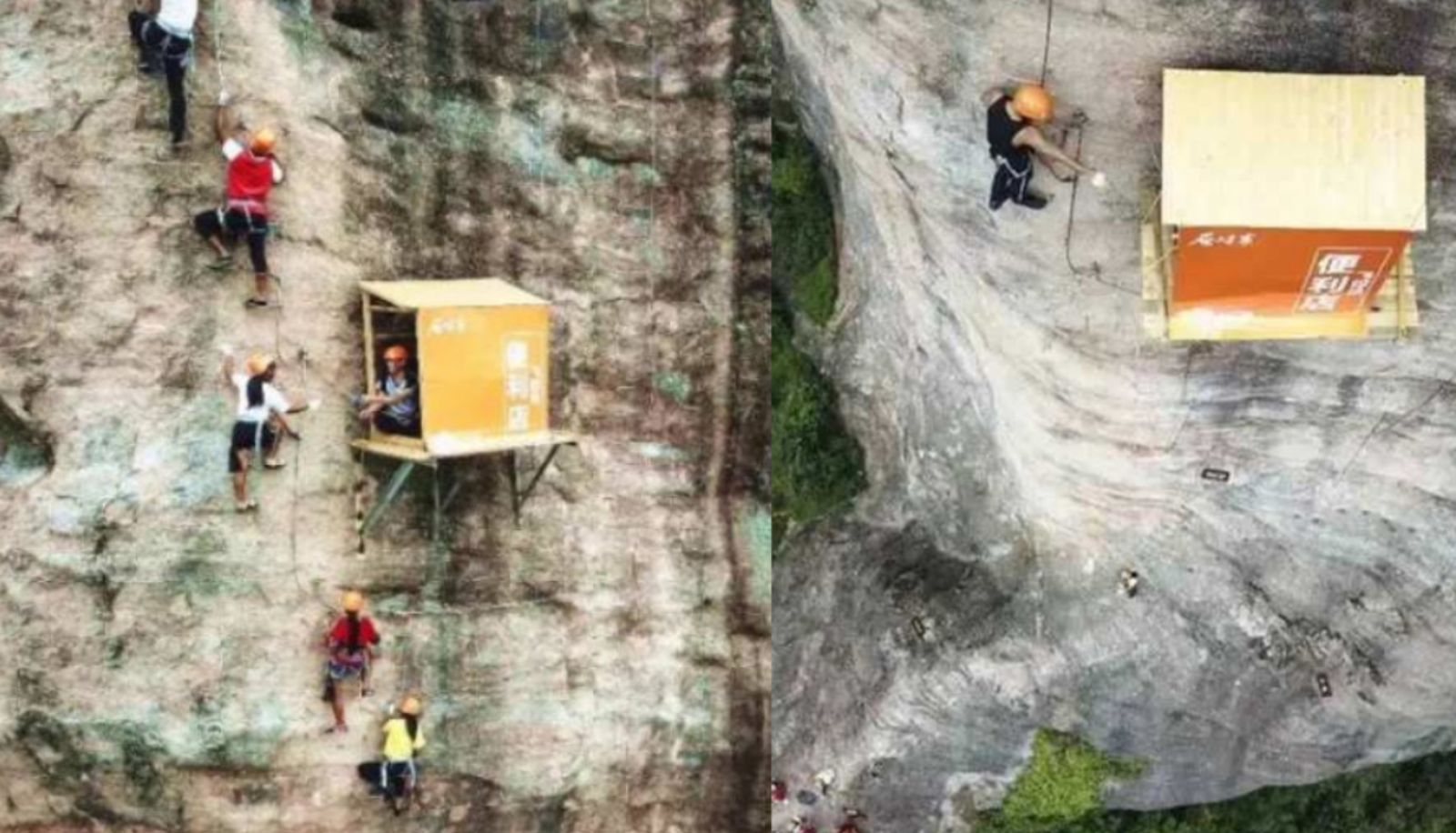考慮到當時正值中秋假期,景區吸引了大量遊客前來攀岩。這家被戲稱為「最不便利的便利店」的店鋪,也特別在店內準備了200個免費月餅,供遊客自行取用。不過,前提是遊客必須自行攀爬到店鋪位置。