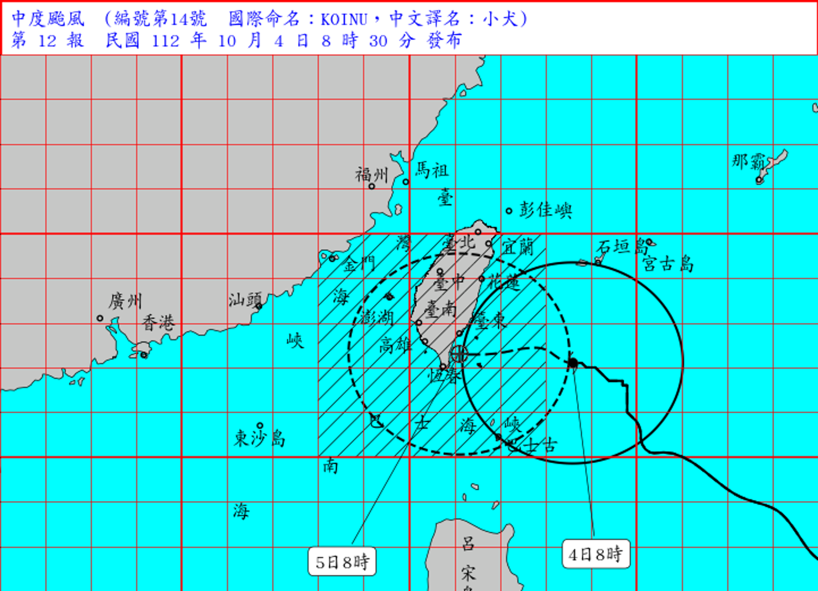 中央氣象署今(4日)更新海上陸上颱風警報,8時的中心位置在北緯22.1度、東經123.6度,即在鵝鑾鼻的東方約280公里之海面上,以每小時11公里速度,向西進行,近中心最大風速每秒43公尺,瞬間最大陣風每秒53公尺,七級風平均暴風半徑250公里,十級風平均暴風半徑90公里。