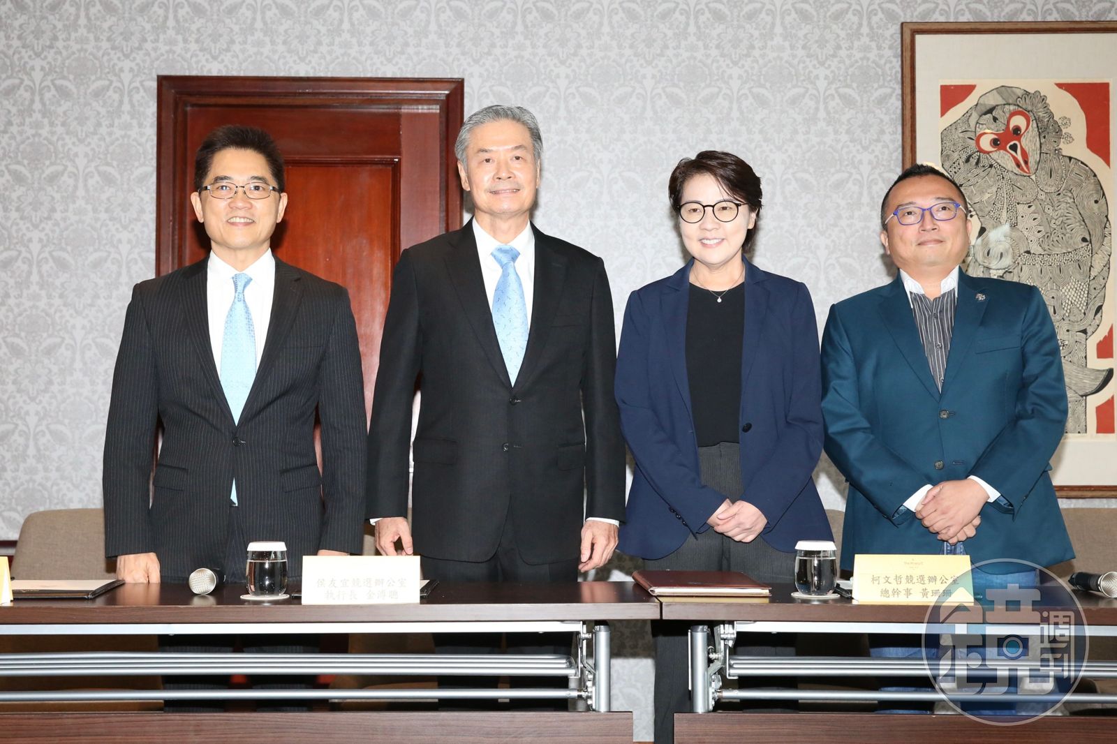 這場在野力量整合會議今下午1點半在福華飯店登場,藍白對談代表共4人陸續進場後,在對談前先共同舉行會前記者會,黃珊珊入座前,金溥聰還幫黃拉了椅子,並由黃珊珊先行發言。