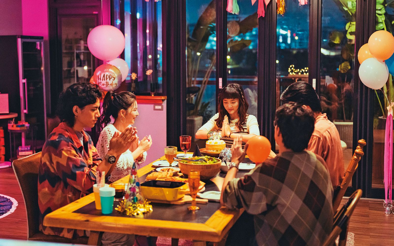 單元〈戀愛實境秀〉以王淨(左三)和朱軒洋(左一)為主角,全劇8成演員亦短暫出場,待後續單元展開不同故事。(Netflix提供)發布時間:2023.11.07 05:58 臺北時間