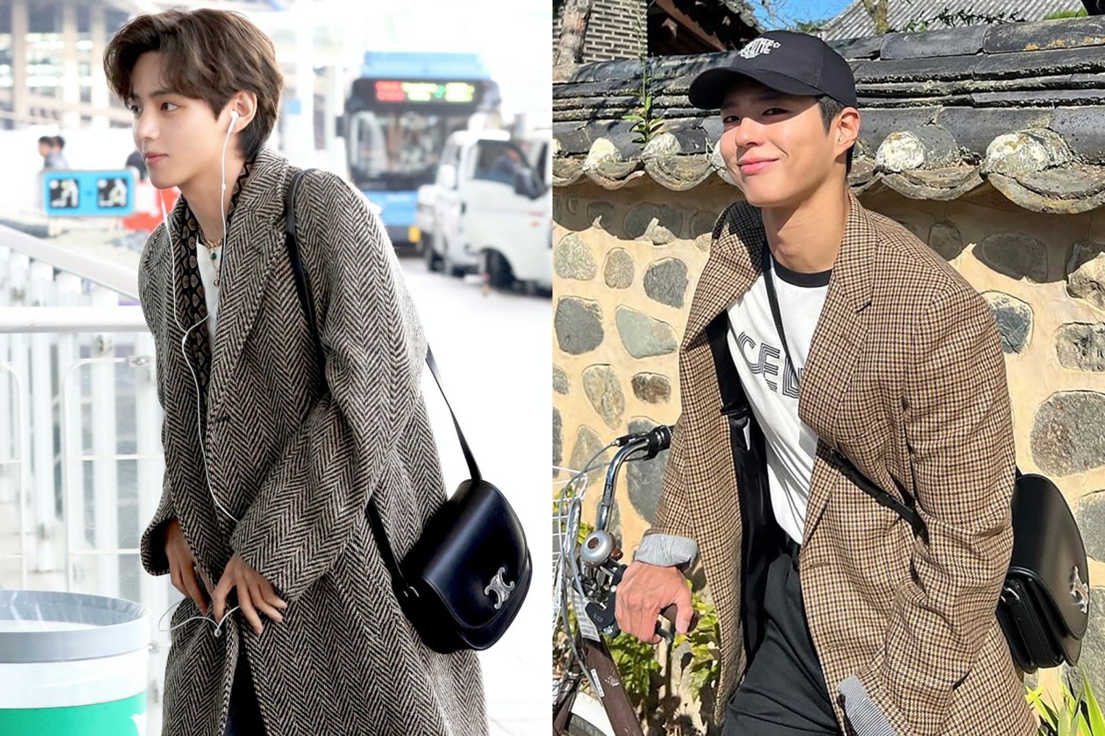 (左起)V金泰亨與朴寶劍皆以英倫風造型搭配最新BESACE TRIOMPHE手袋。(CELINE提供)發布時間:2023.11.12 19:51 臺北時間