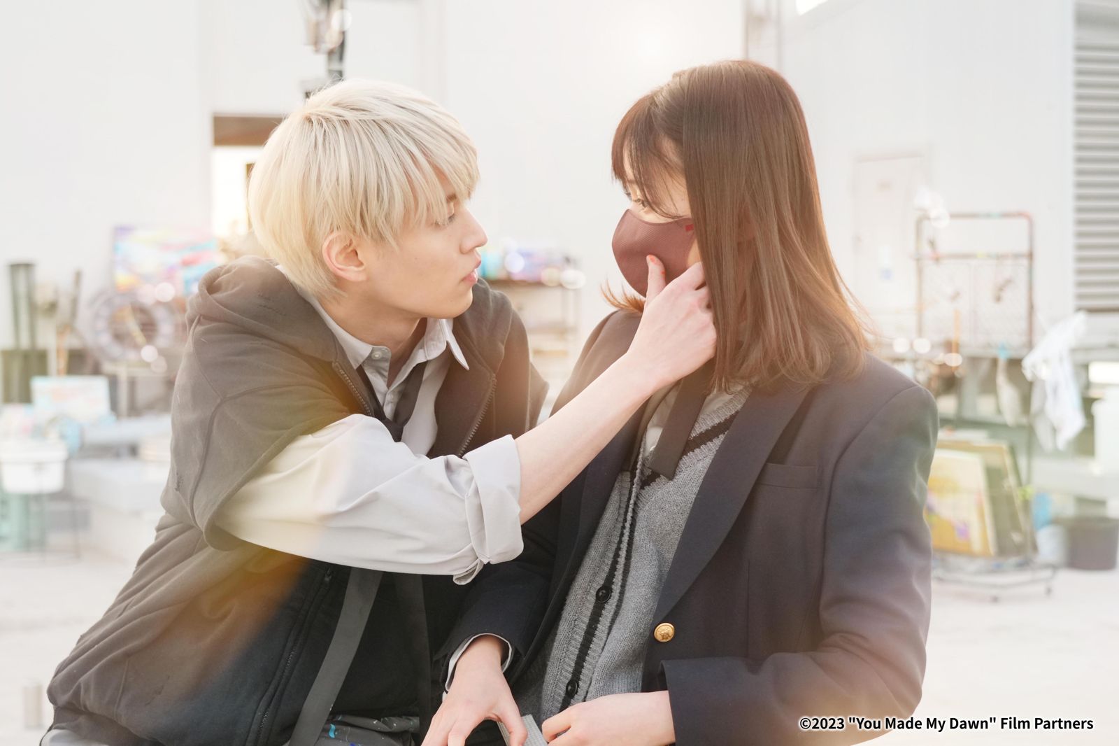 首次登上大銀幕便擔綱主演的白岩瑠姬,演出別具繪畫天分、但時常翹課的高校生青磁,與新生代演員久間田琳加演出的乖乖牌資優生小茜,兩人因性格差異與衝突間擦出愛火,更在片中展現於課間藍芽耳機傳情、校園屋頂幽會、遊樂場夜遊等浪漫橋段,製造戀愛感爆棚的氛圍。