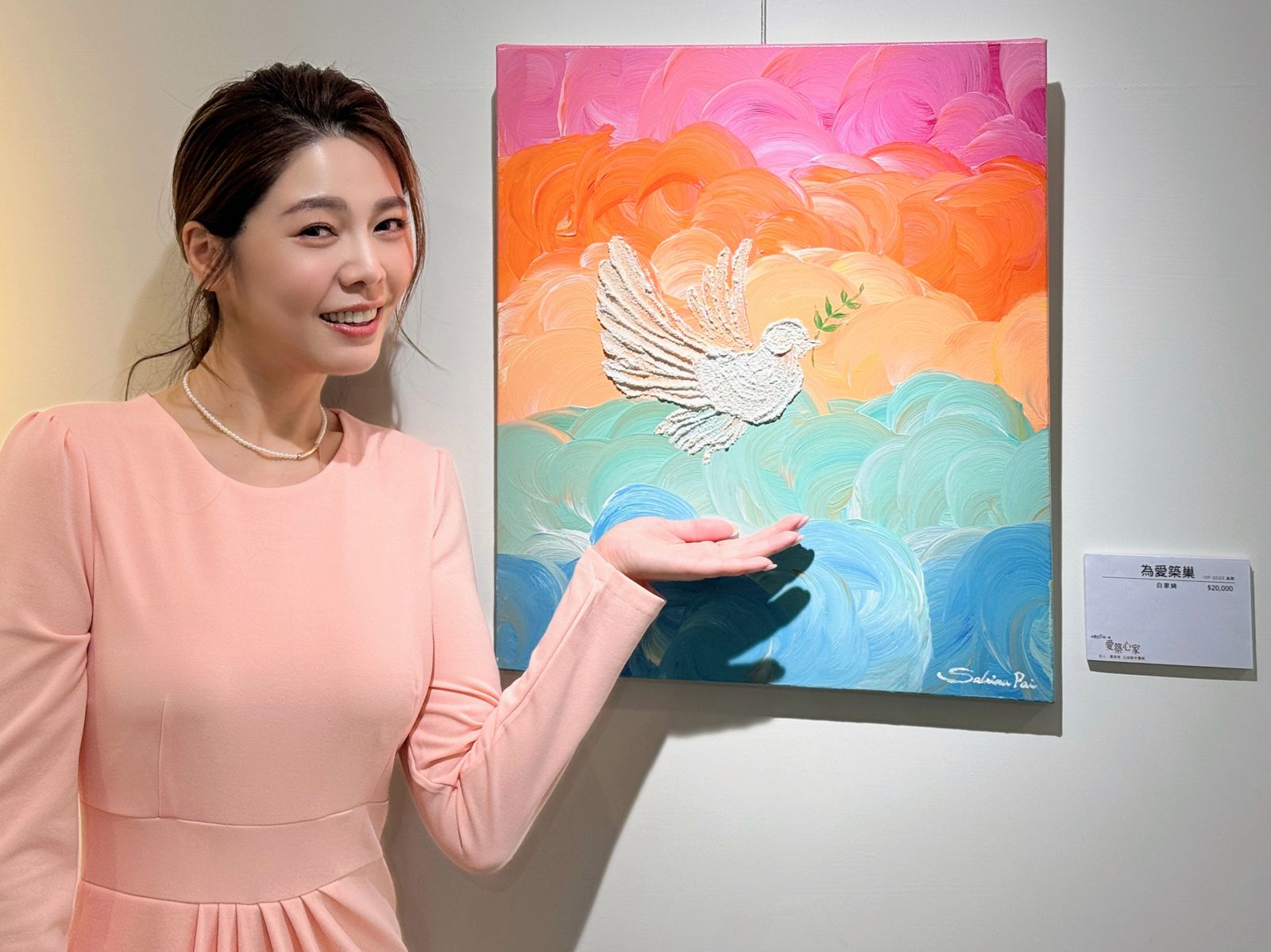 白家綺也在現場即興創作流動畫「愛的流動」,力邀社會中每一雙「樂於發現美的眼睛」,即日起至12月24日蒞臨現場賞畫、公益認助,為2024年即將動工的「兒少福利園區」募集迫切需求的興建支持。公益聯合畫展由藝人白家綺、賴雅妍、黃小柔及藝術家劉薰愛老師、王如茵師生、黃重元老師與其膠彩畫協會成員號召捐畫響應。