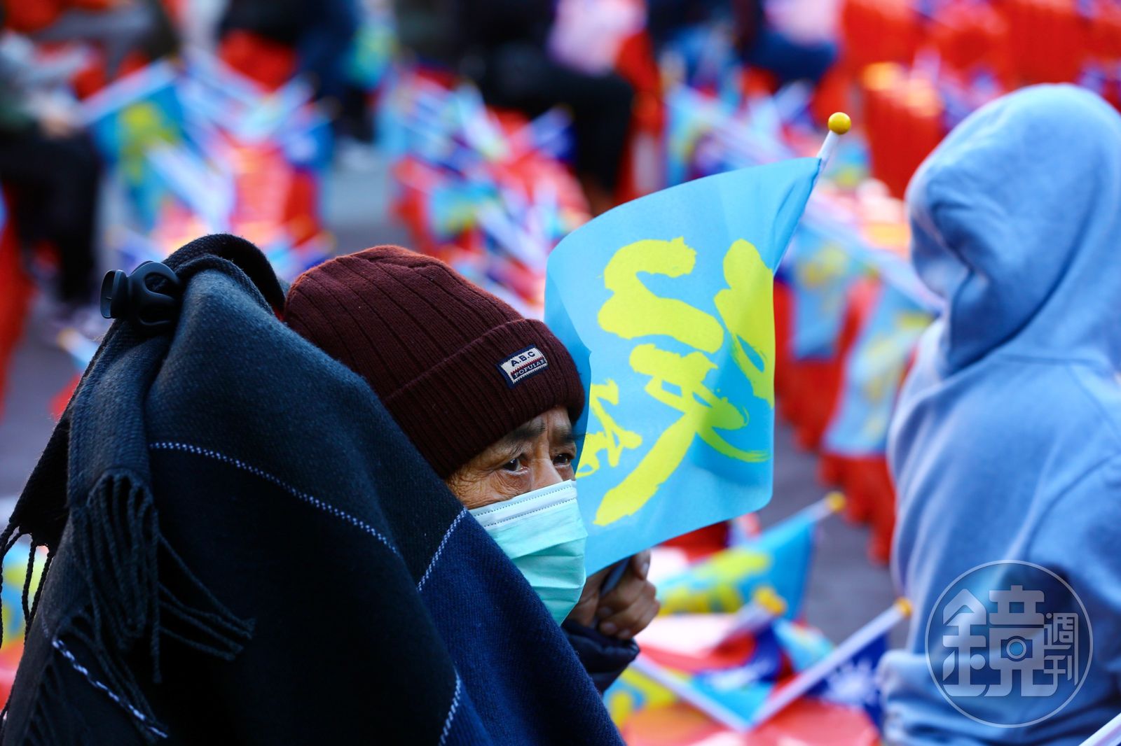 侯友宜支持者在競總外高舉旗幟,等待開票結果。發布時間:2024.01.13 18:32 臺北時間