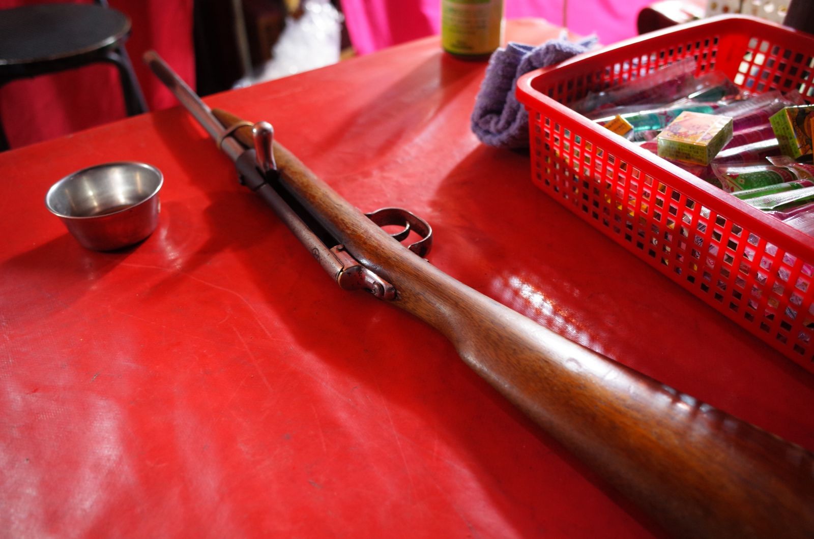 警方趕到現場後,發現賴男身邊放有一把合法登記的原住民自製獵槍,不過木製槍托已拆卸,僅剩槍管、槍機,槍管對準頭部,板機處則貼有用來固定鐵棒的膠帶,現場無打鬥痕跡,因此不排除賴男為自戕身亡。
