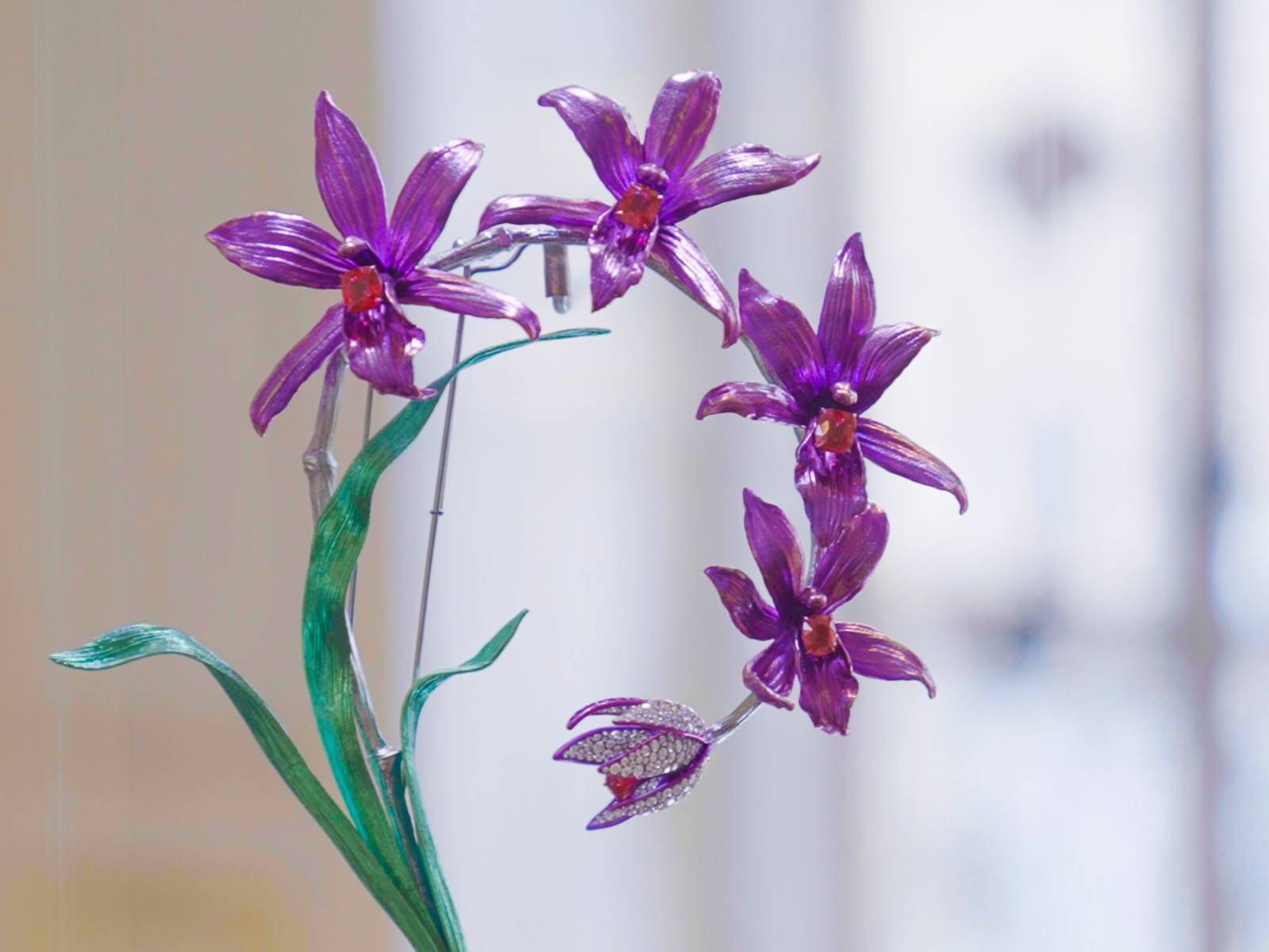 這款胸針的尺寸超過 19 公分,以鈦金屬工藝打造,重量僅 53.5公克。特殊處理的鈦金屬鍍上一層鮮艷粉紫色澤,呈現出花瓣絲滑的質感,此乃資深工匠運用特殊上色技術Titanium Anodizing在超過1,500度高溫下,嚴格把控時間而於金屬表層形成一層固定厚度且緻密均勻的氧化膜才得以獲得。而每片花瓣皆以極其精緻工藝製成,展現有如真花般的柔軟感和細膩紋理。而蘭花的寶石,則選擇以5顆重約1.5克拉的天然無燒紅色尖晶石為主石呈現,鑲嵌於每一支花蕊之上,成為視覺焦點,再點綴以超過 300 顆圓形明亮切割的鑽石,使整件作品增添耀眼的光彩。
