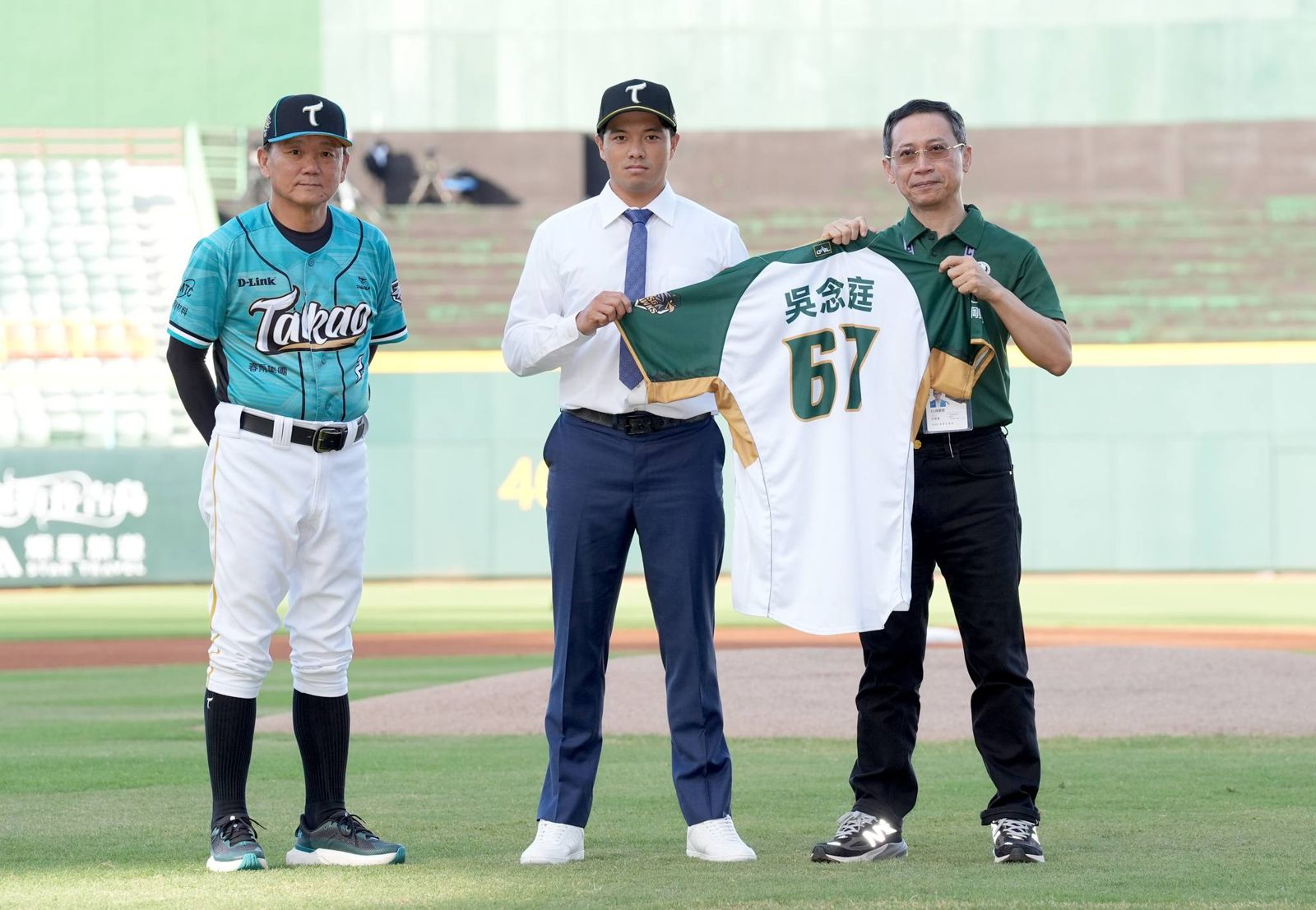 吳念庭今日現身高雄澄清湖棒球場,加盟儀式上由總教練洪一中替他戴上台鋼球帽、董事長王炯棻帶來67號主場球衣迎接他加盟雄鷹。